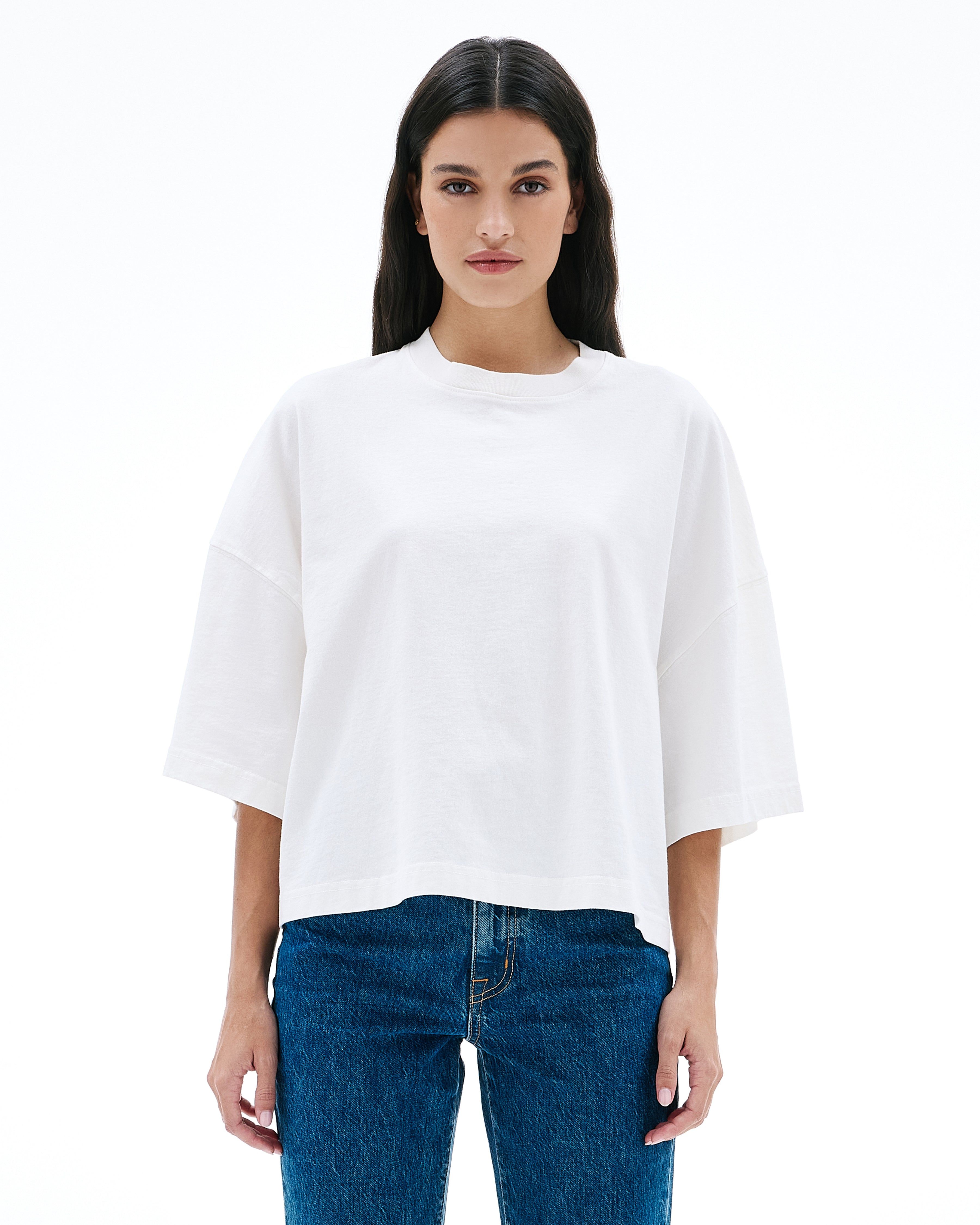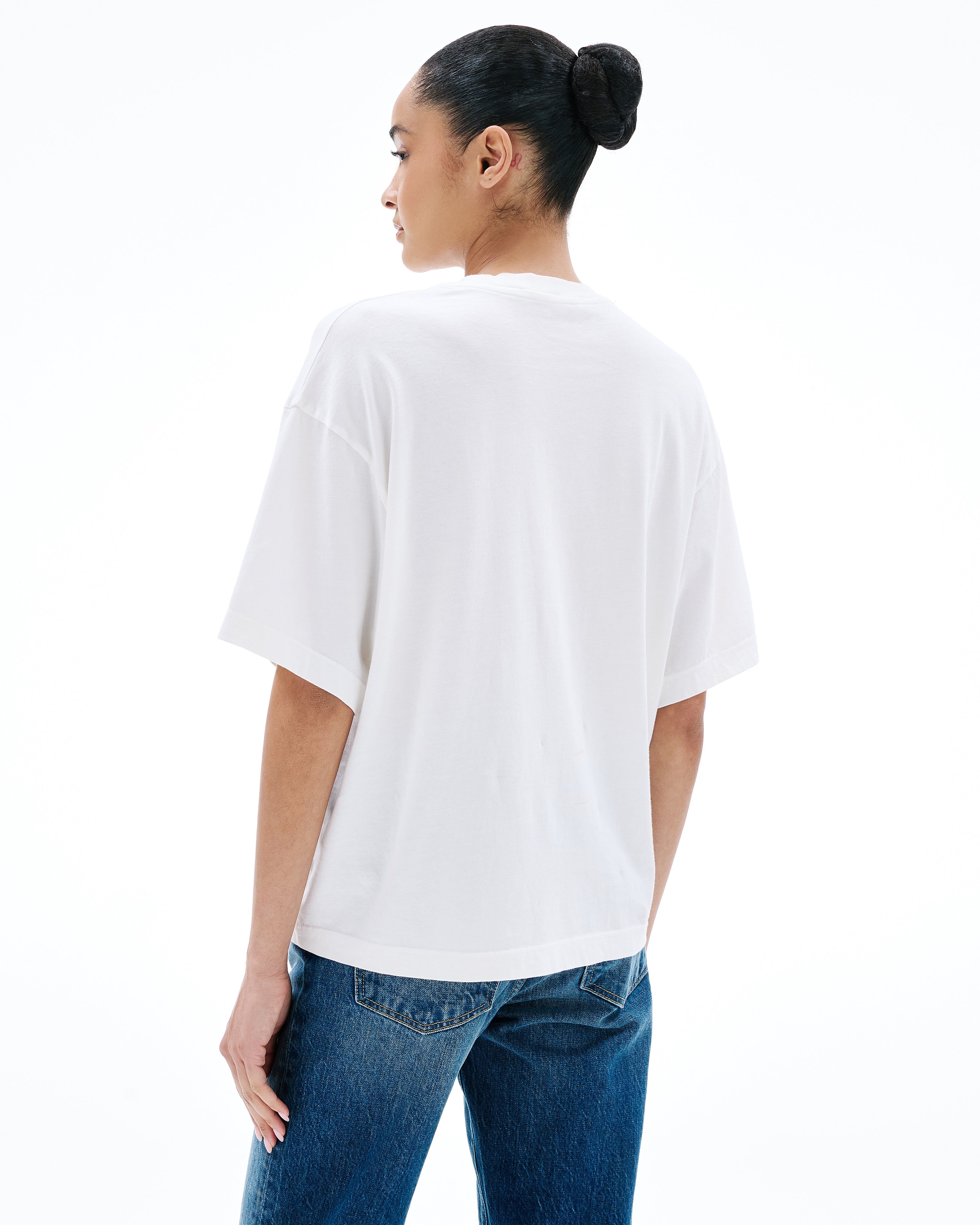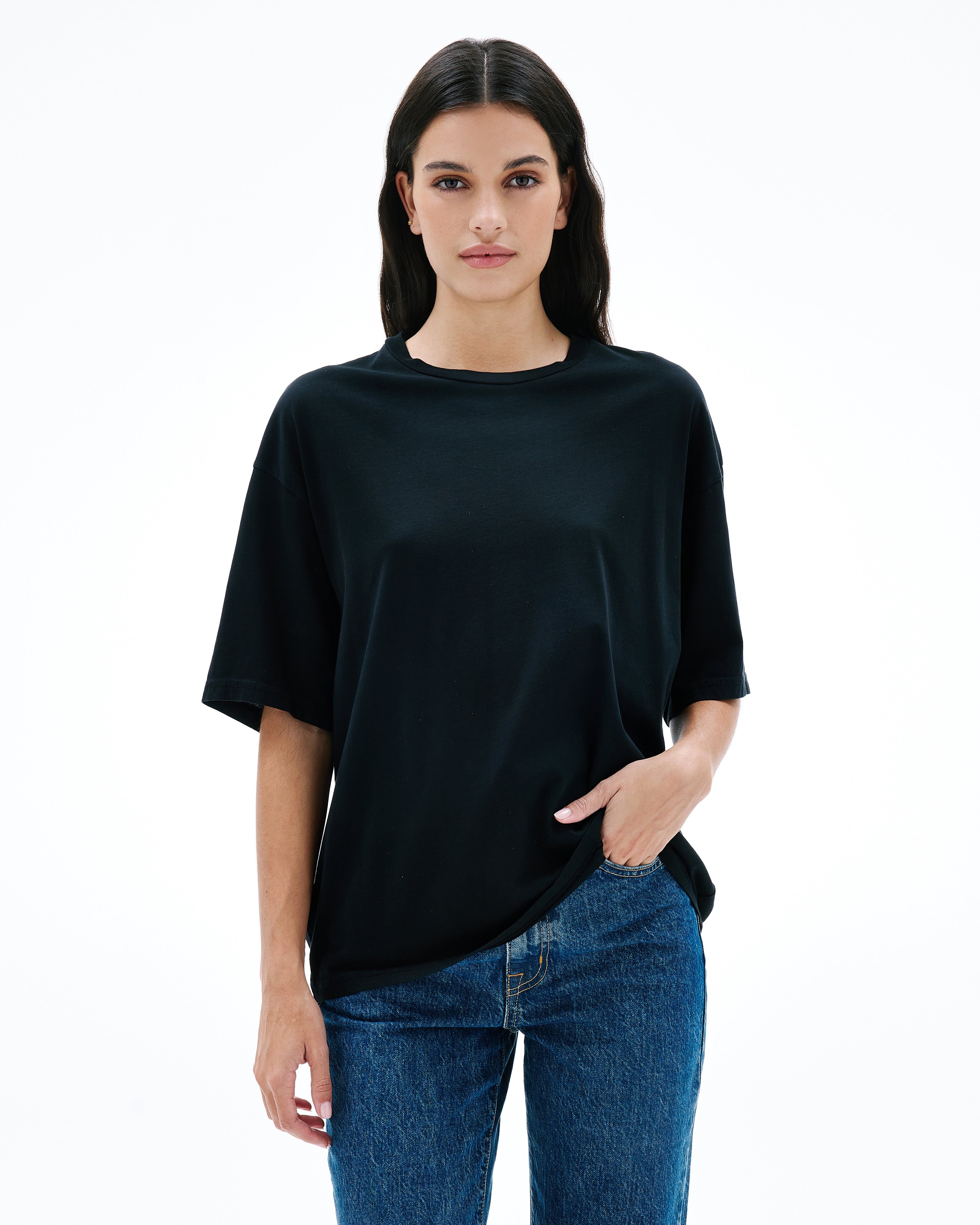 Designed with an oversized silhouette and dropped shoulders for a silhouette borrowed from the boys, this style is finished with clean binding details. Quality and craftsmanship are at the heart of SLVRLAKE. This garment is 100% made in the USA.
