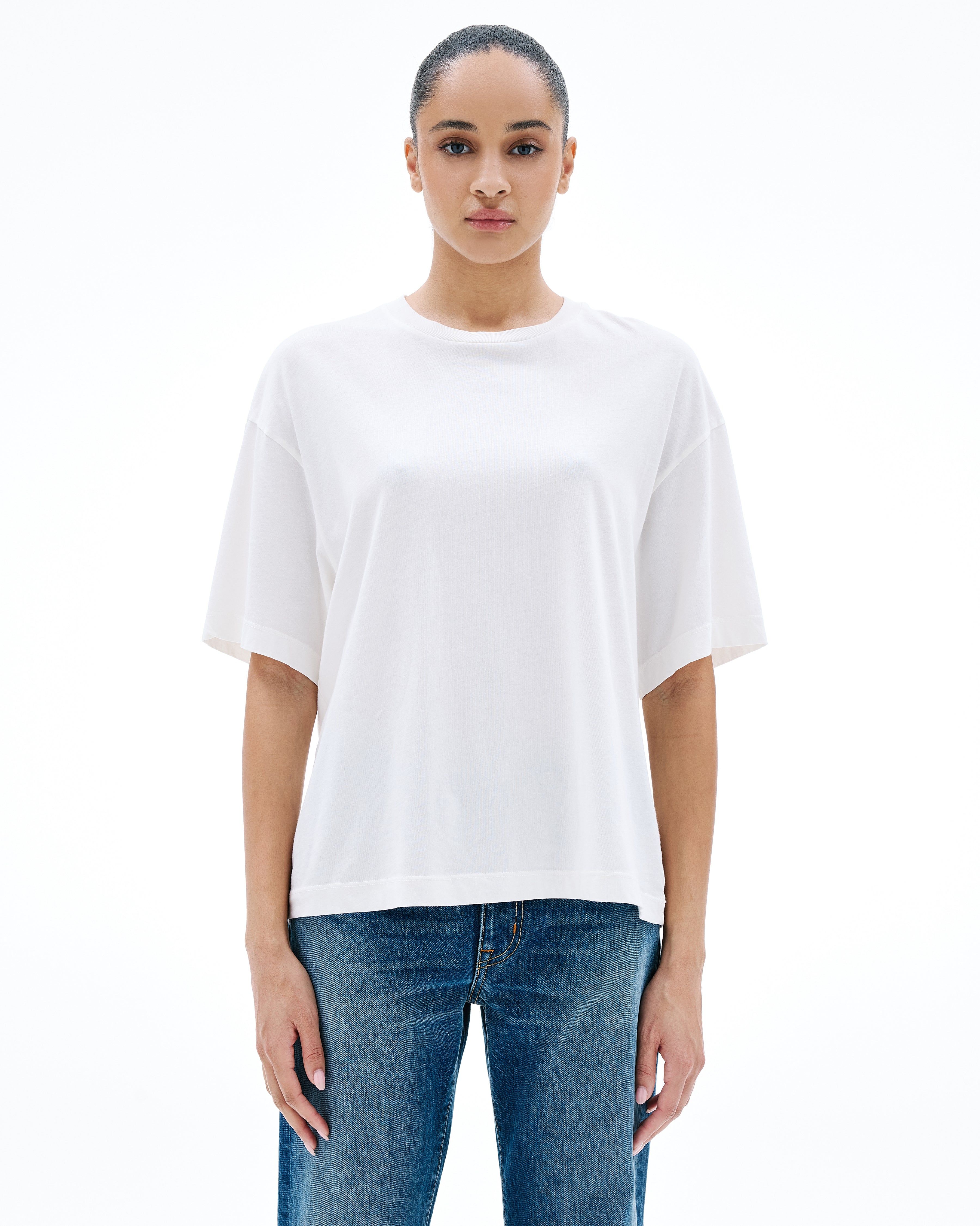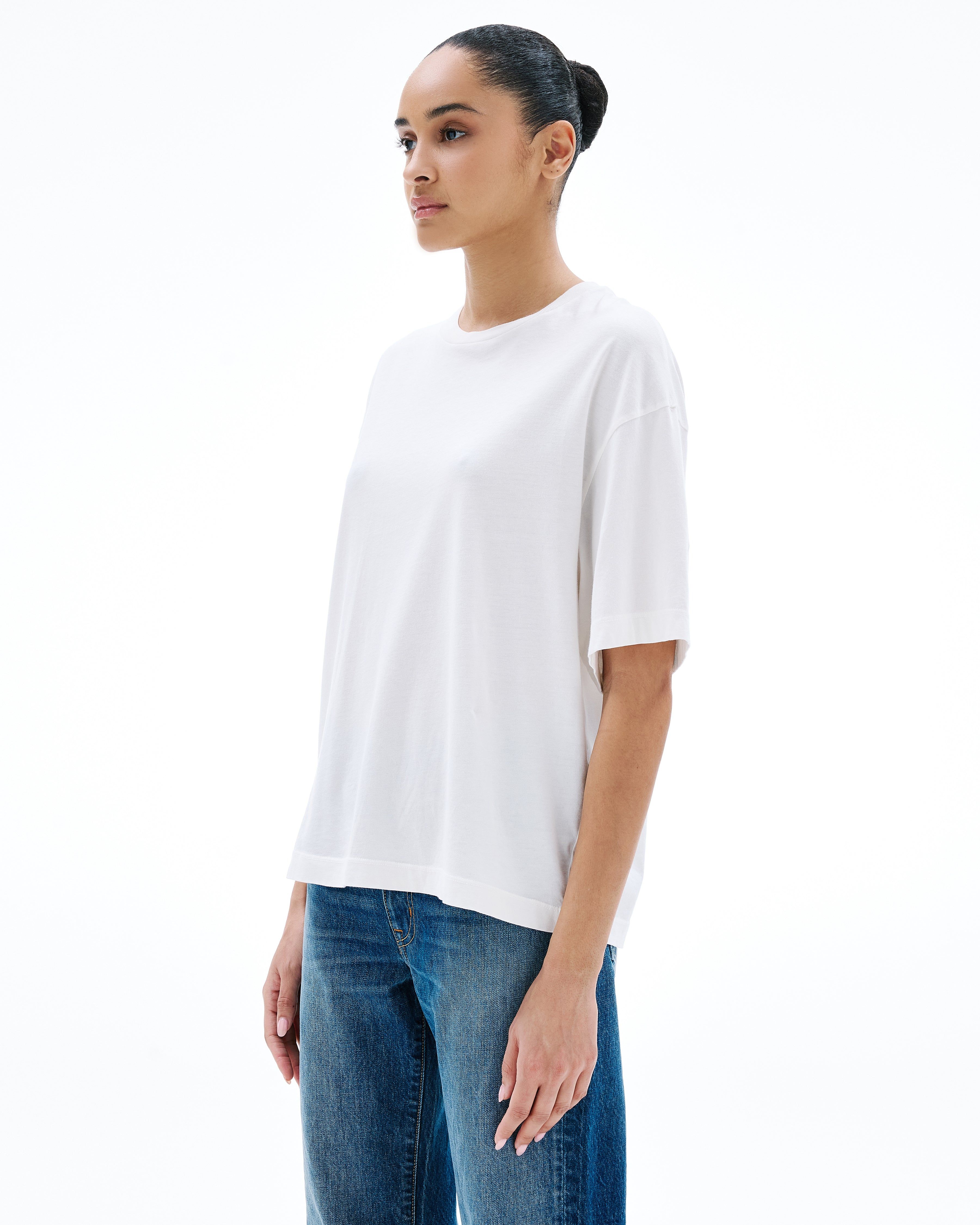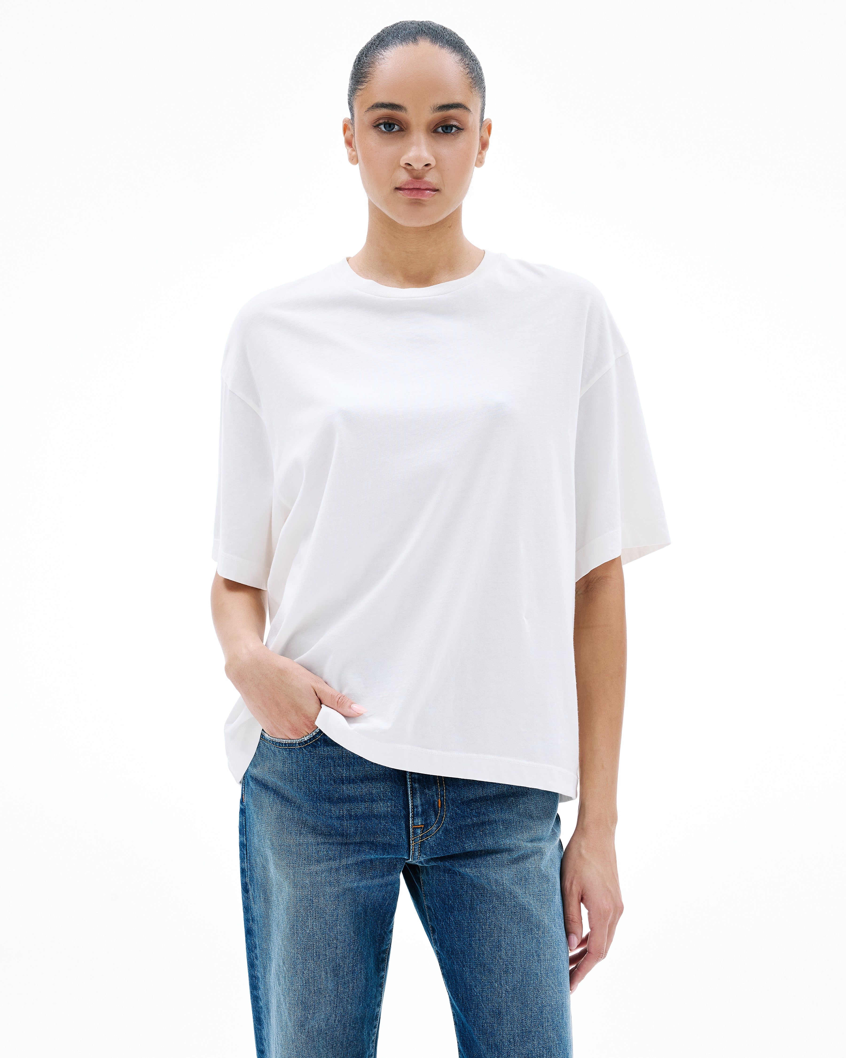 Designed with an oversized silhouette and dropped shoulders for a silhouette borrowed from the boys, this style is finished with clean binding details. Quality and craftsmanship are at the heart of SLVRLAKE. This garment is 100% made in the USA.