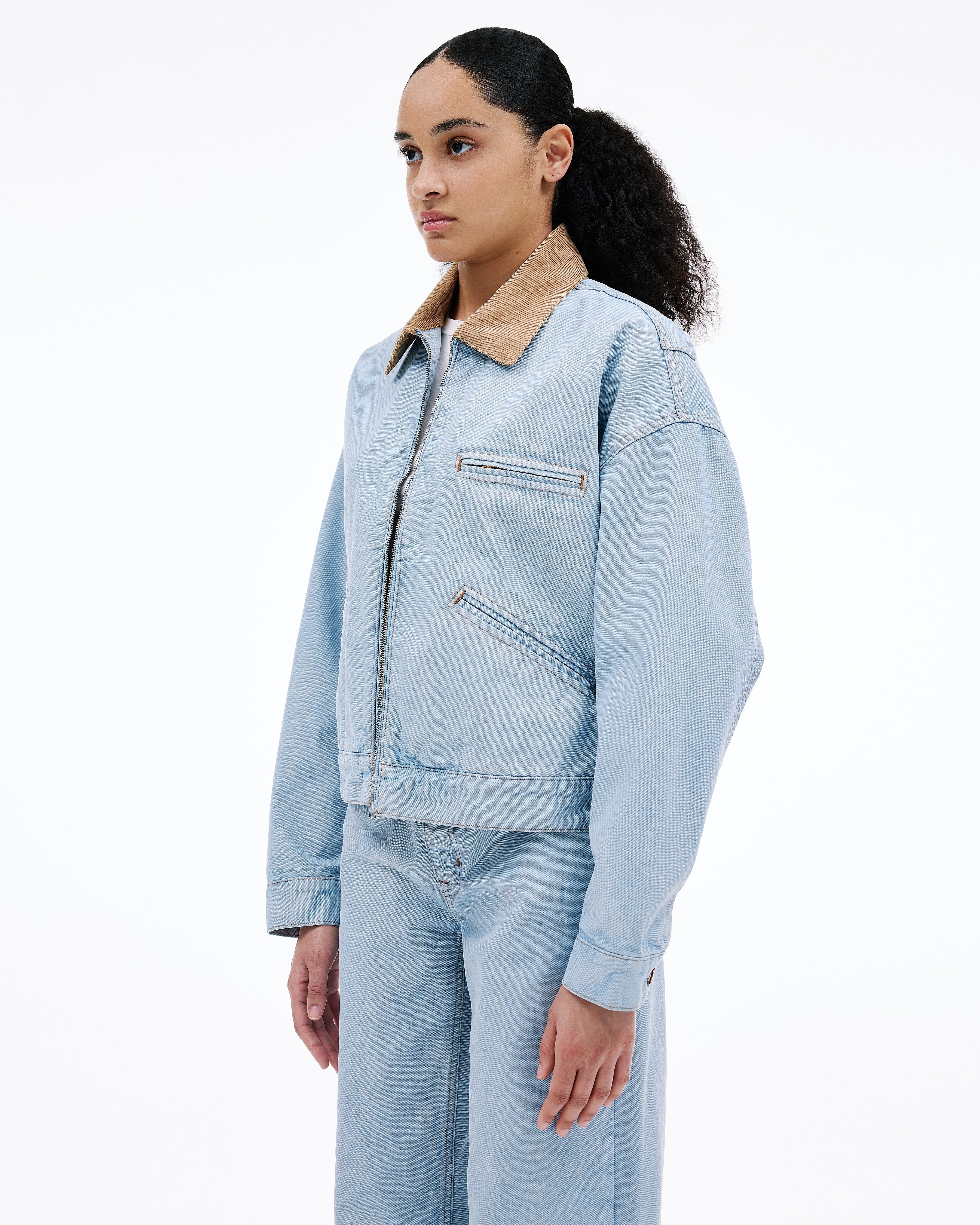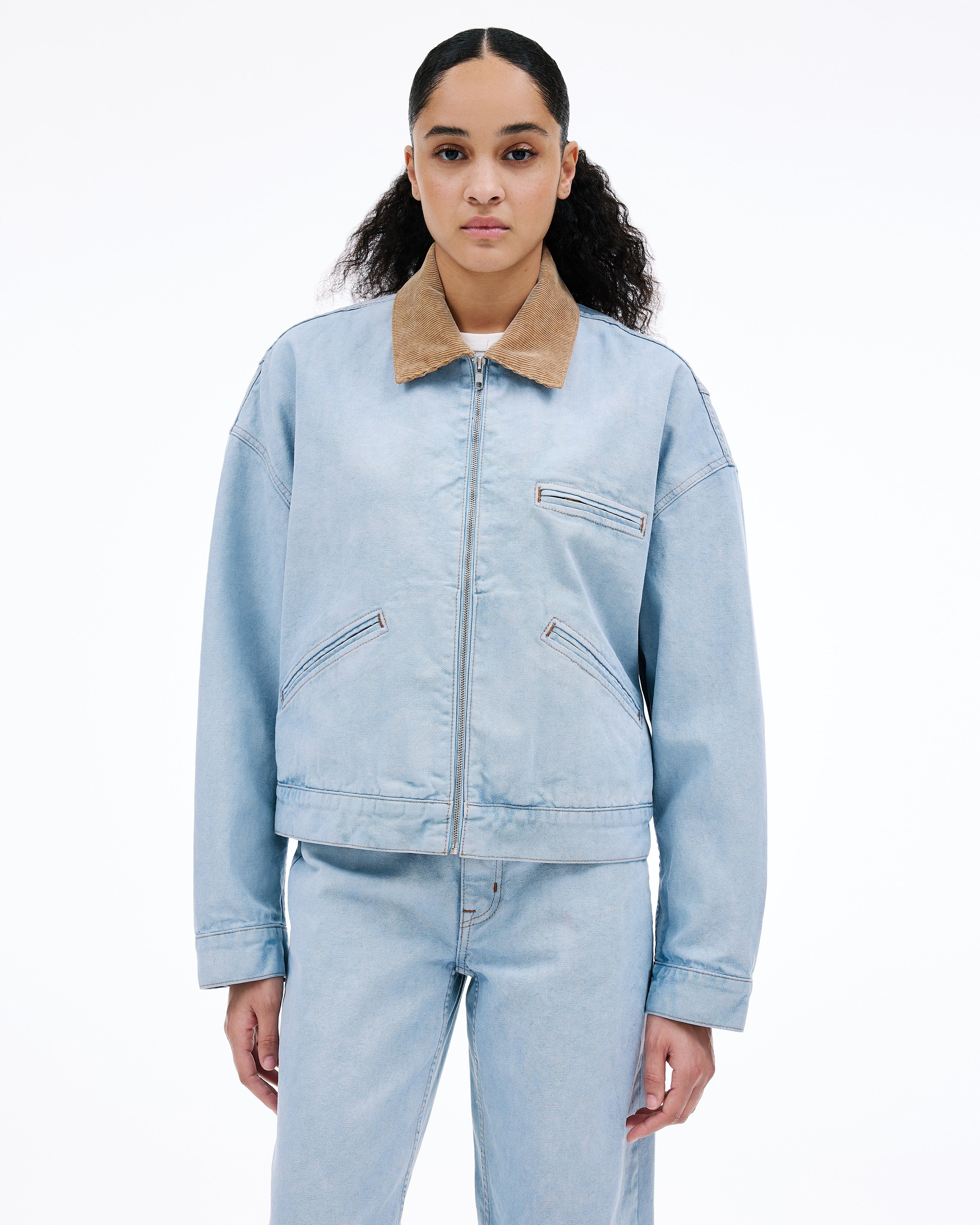Camden Garage Jacket is crafted from cotton canvas and features a tonal corduroy collar and front zip pockets, offering a vintage and effortless fit.