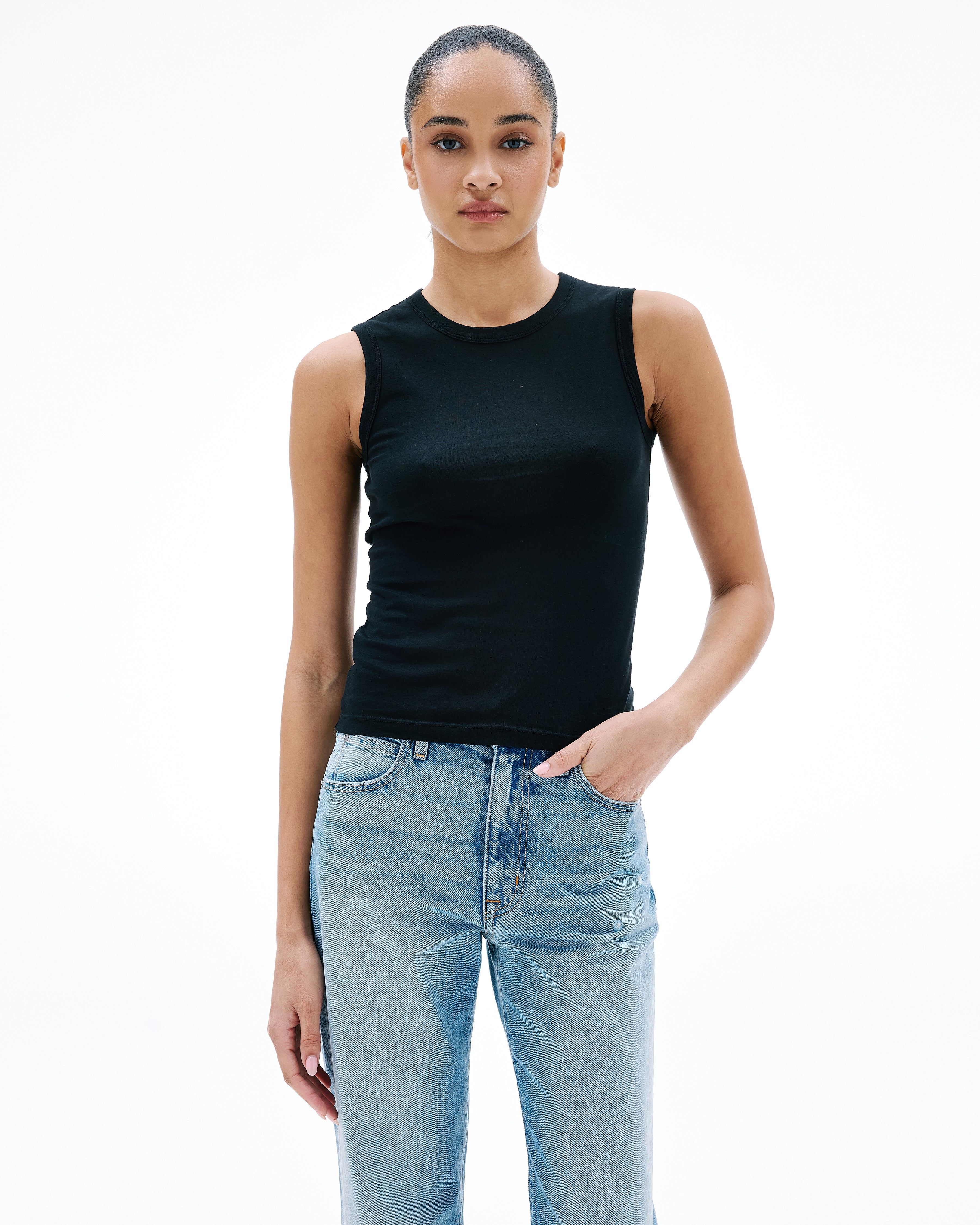 Crafted from premium Supima stretch fabric in a midweight knit, this style offers a soft hand feel and effortless comfort. Designed with a modern silhouette and subtle cap sleeve for an elevated everyday look.