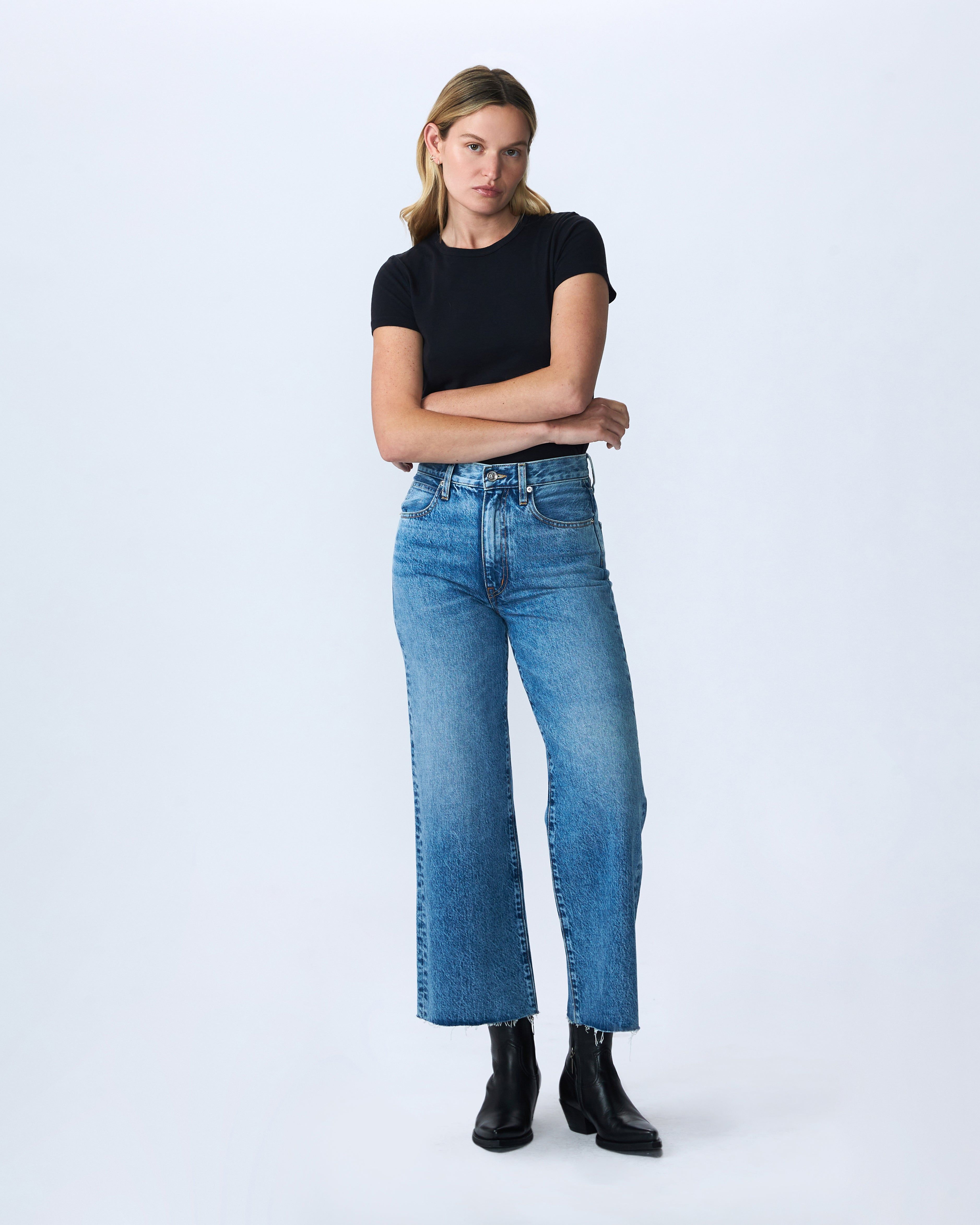 Grace is a SLVRLAKE signature style, offered in a cropped length designed to elongate the leg. Featuring a high-rise waist and wide-leg silhouette, it fits close through the waist and hip before flowing through the leg, finished with a raw hem. An essential style offering versatile styling options.