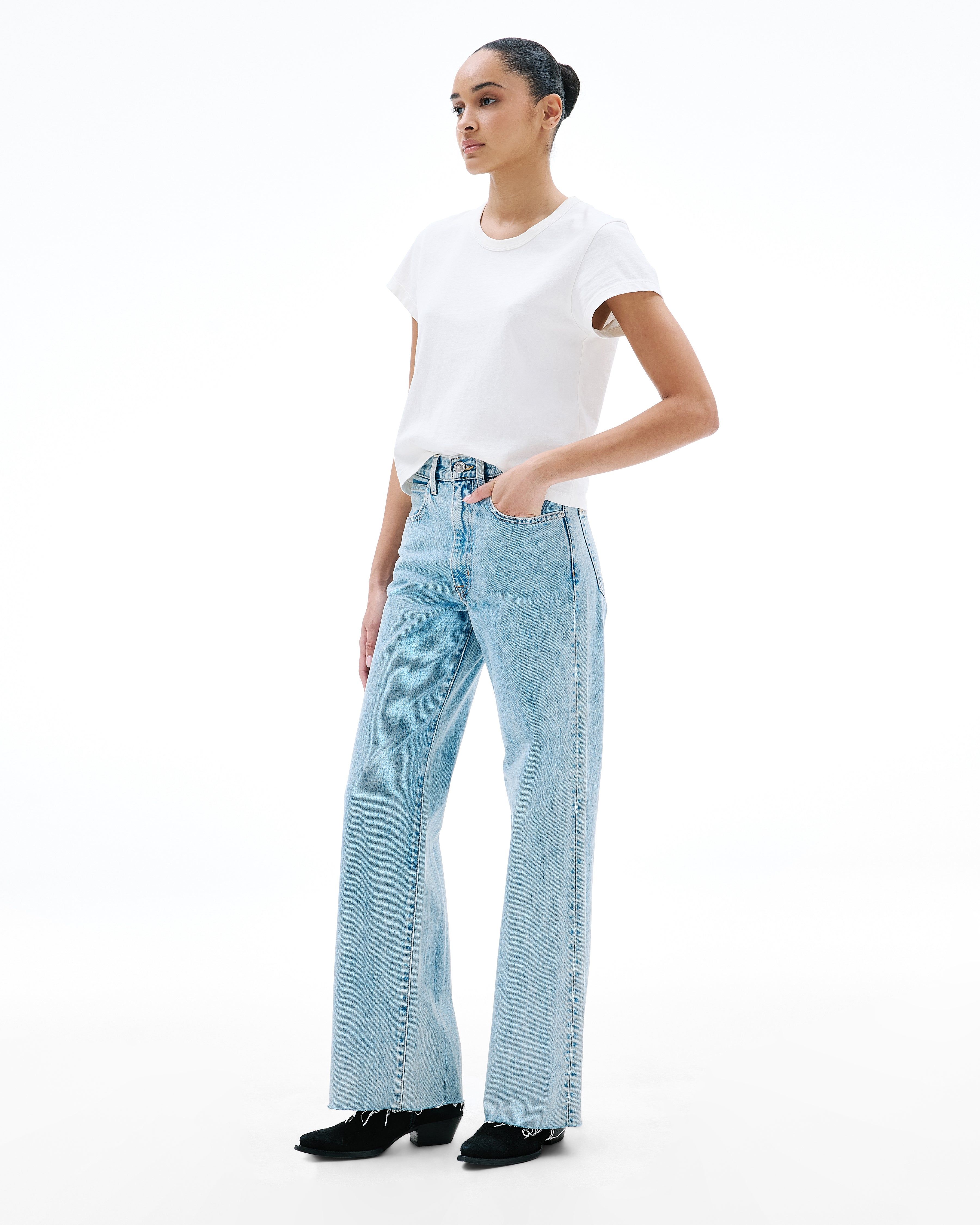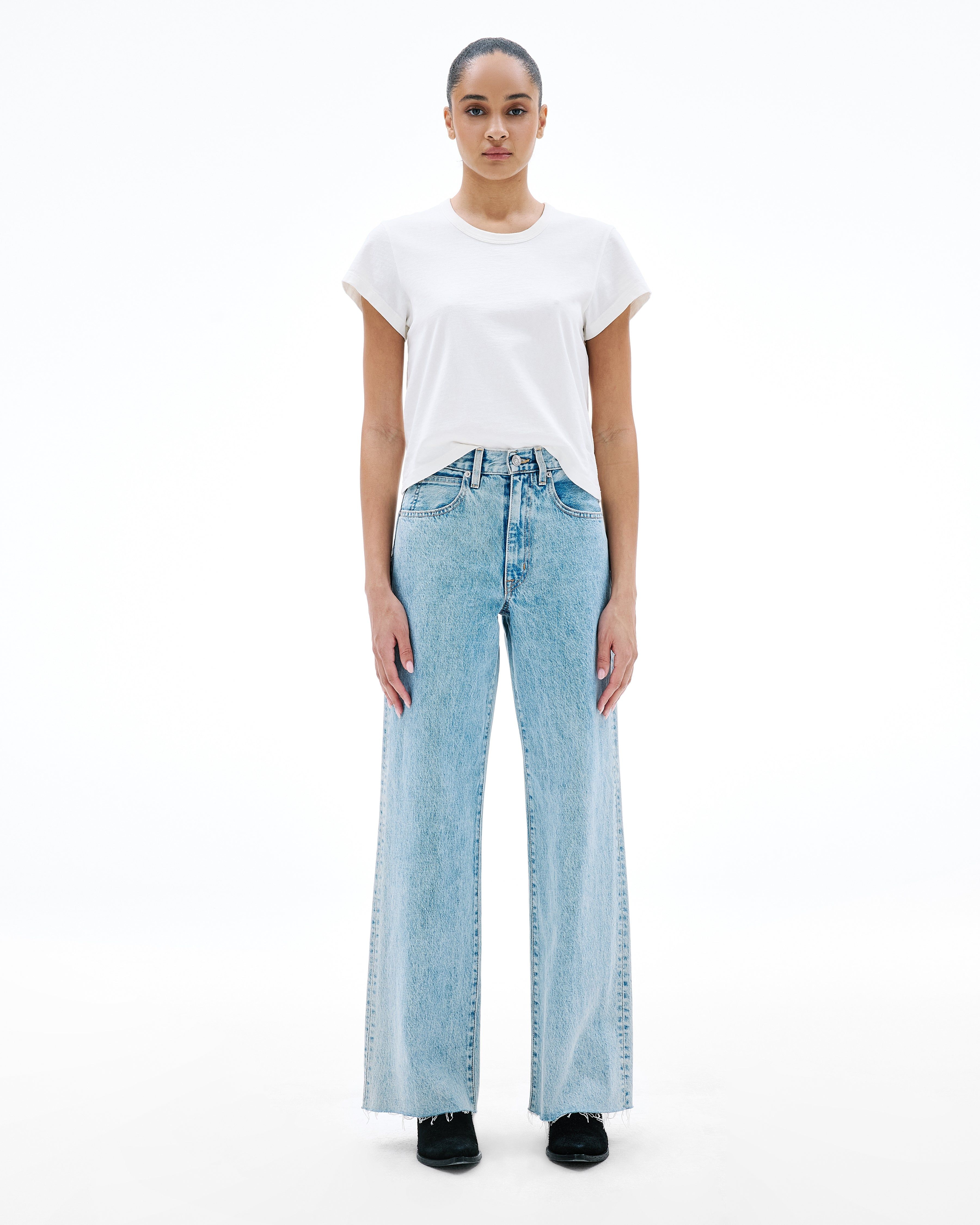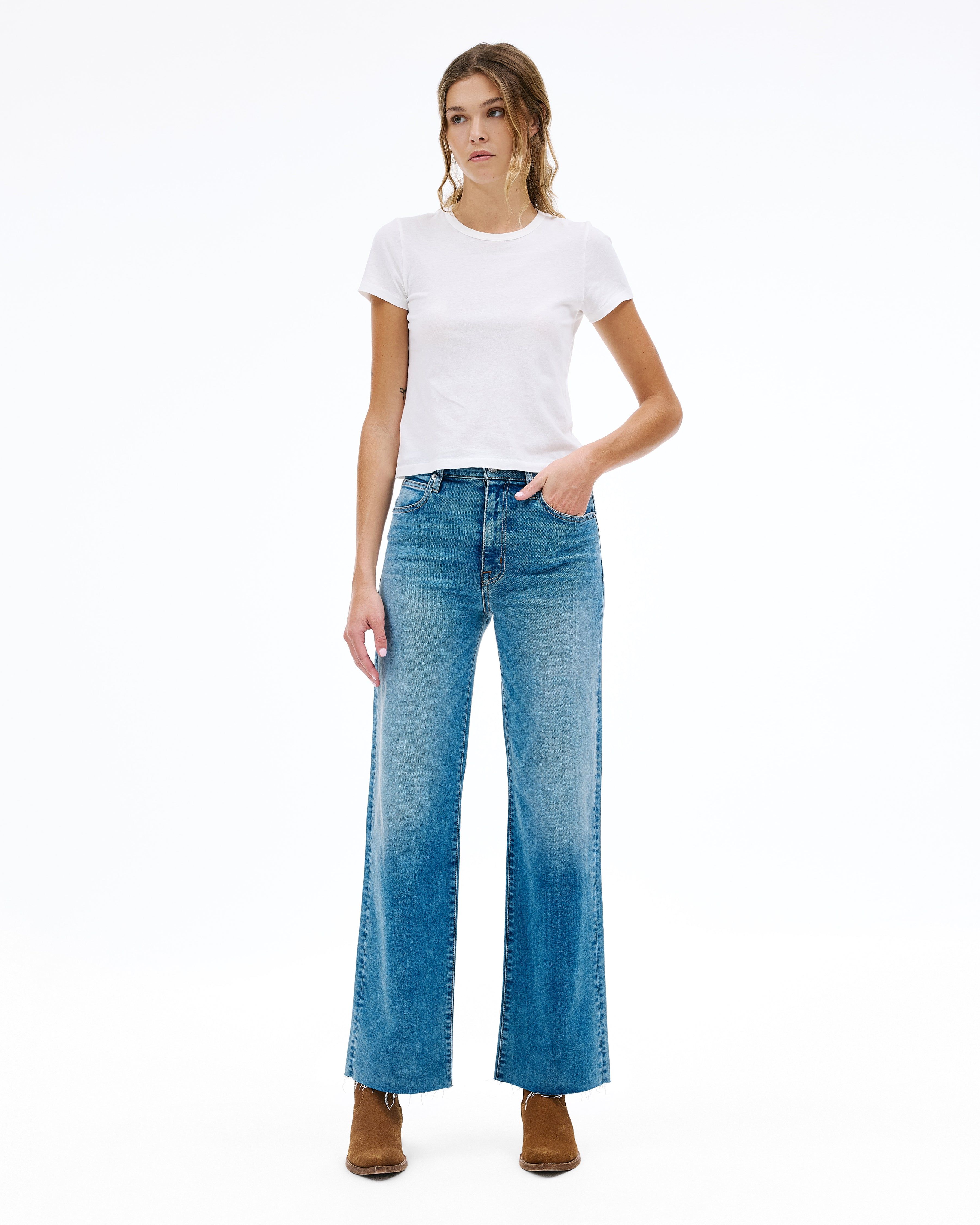 Grace is a SLVRLAKE signature style designed to elongate the leg. Featuring a high-rise waist and wide-leg silhouette, it fits close through the waist and hip before flowing through the leg, finished with a raw hem. An essential style offering versatile styling options.