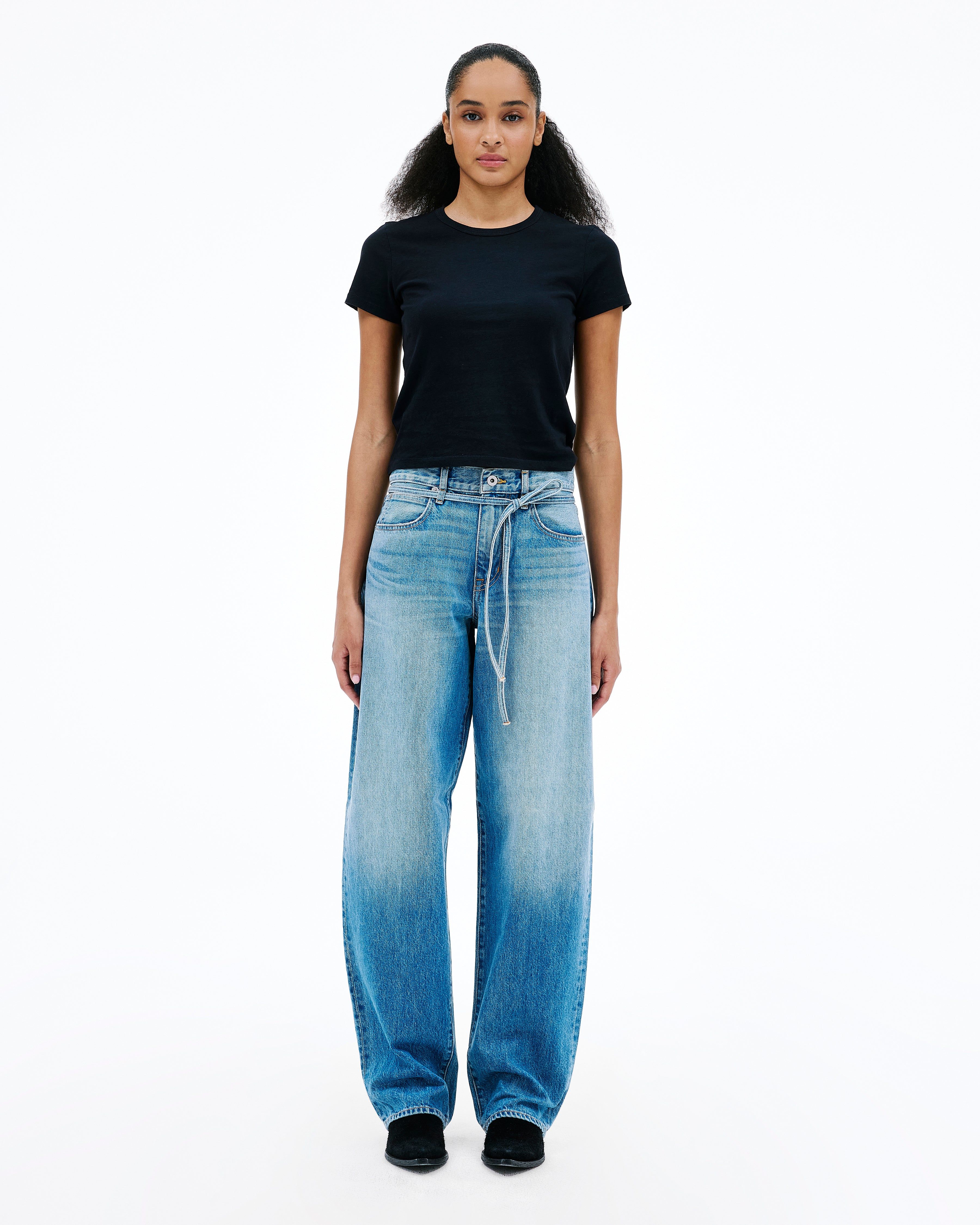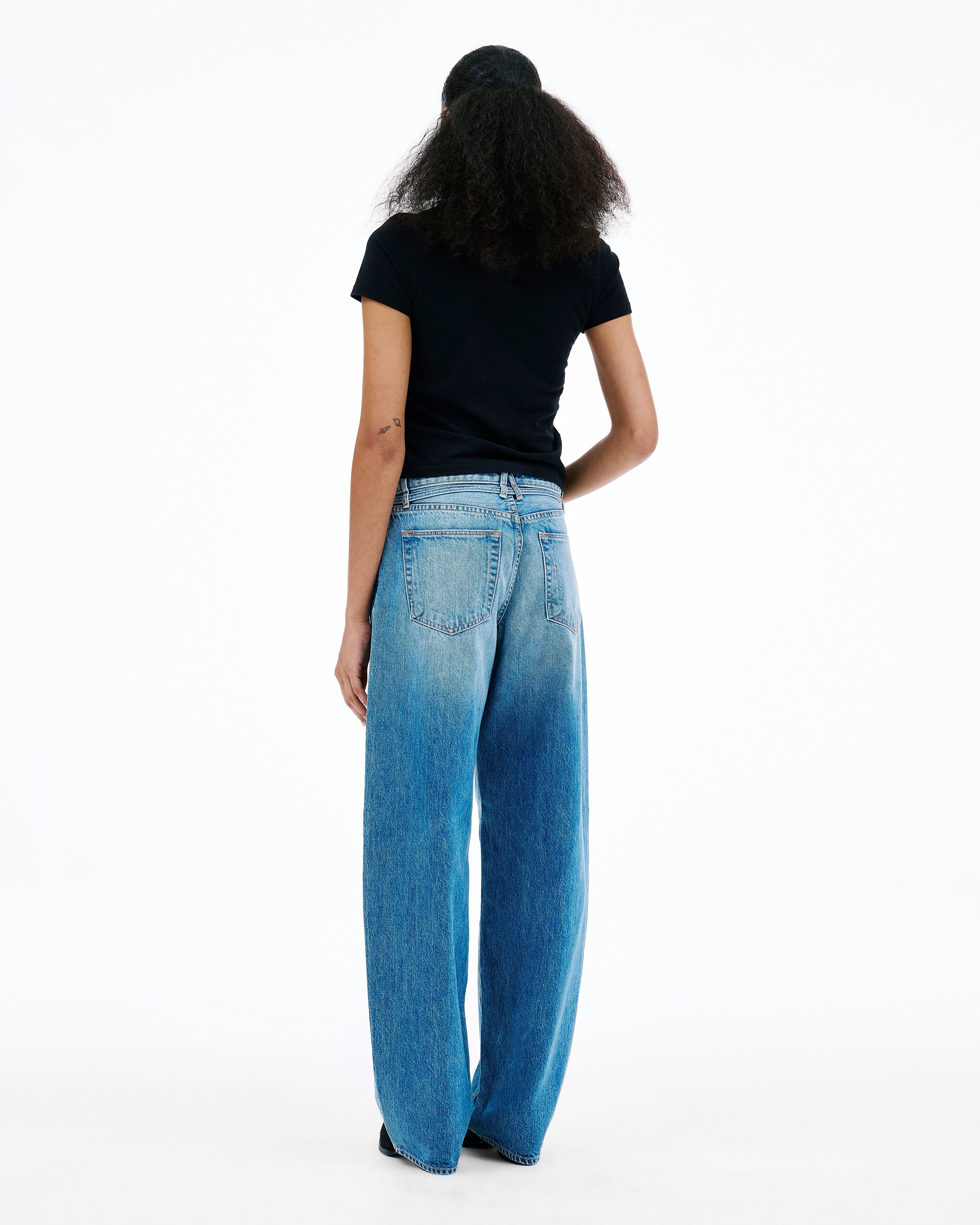 Day Dreamer crafted from 100% Regenerative Cotton and featured in a classic mid blue stone wash with hand-detailed subtle whiskering and finished hem.