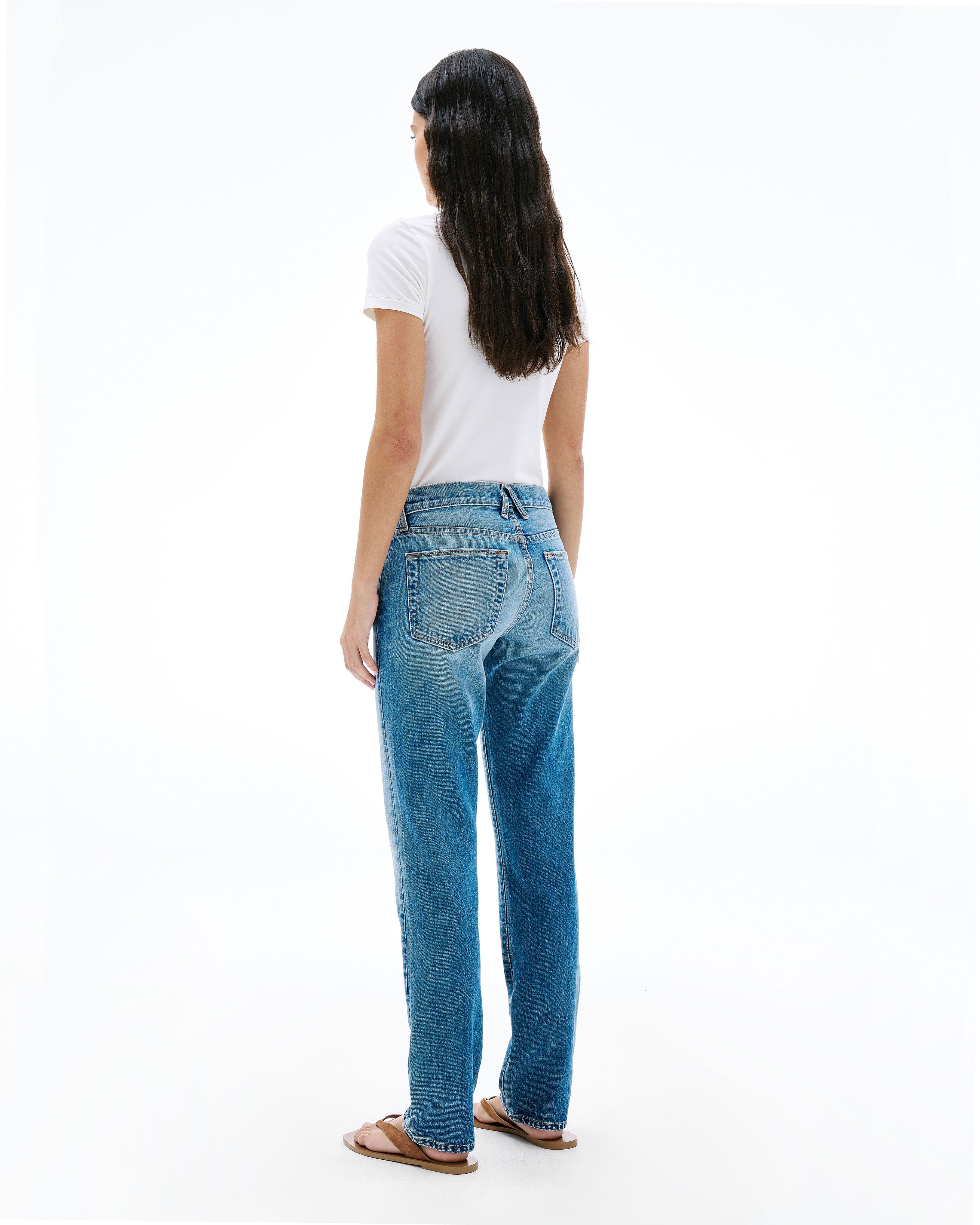 Tow The Line is crafted from regenerative cotton and finished in a mid-blue stone wash, hand-detailed with chevron whiskering and subtle fading for a clean, vintage-inspired look.