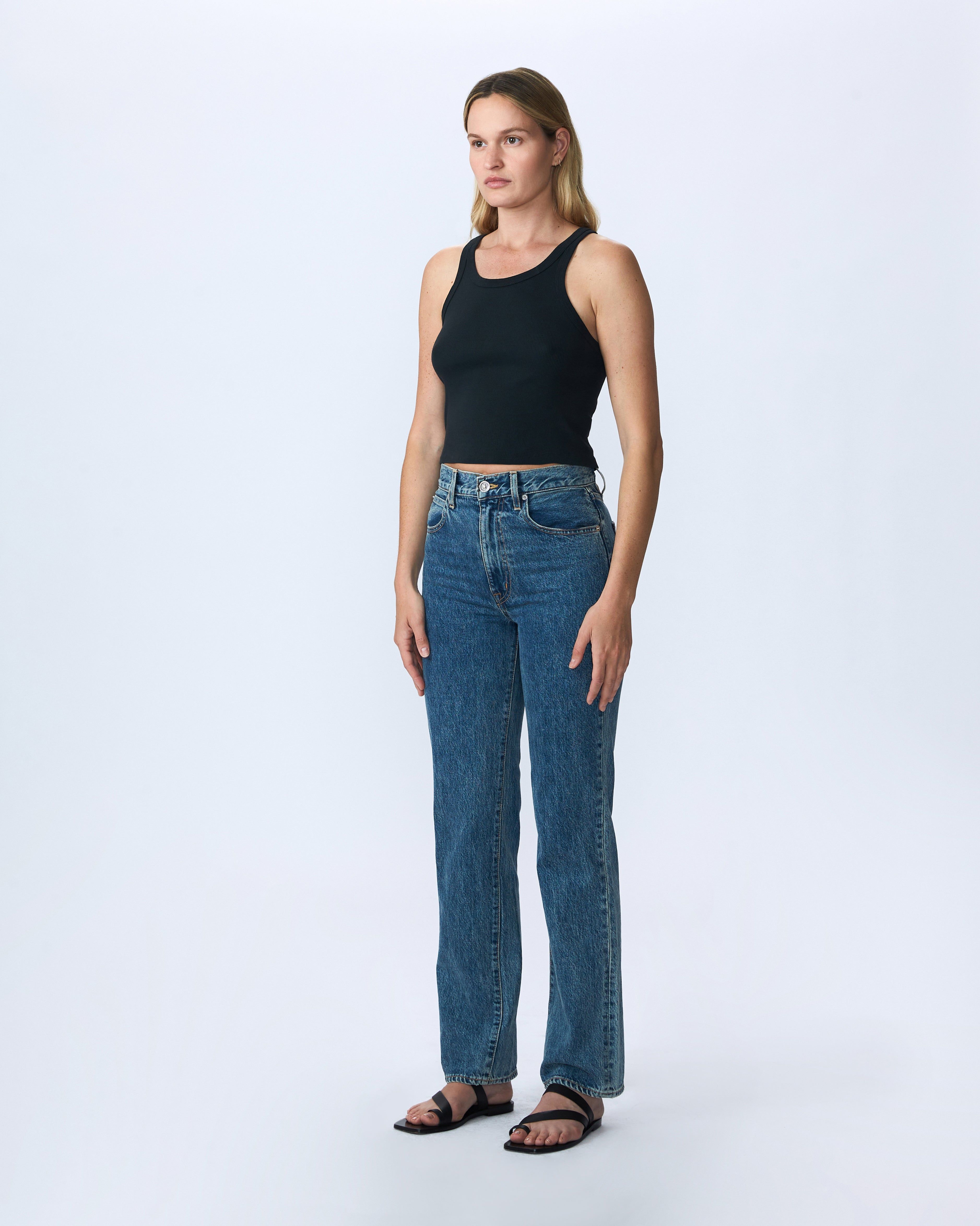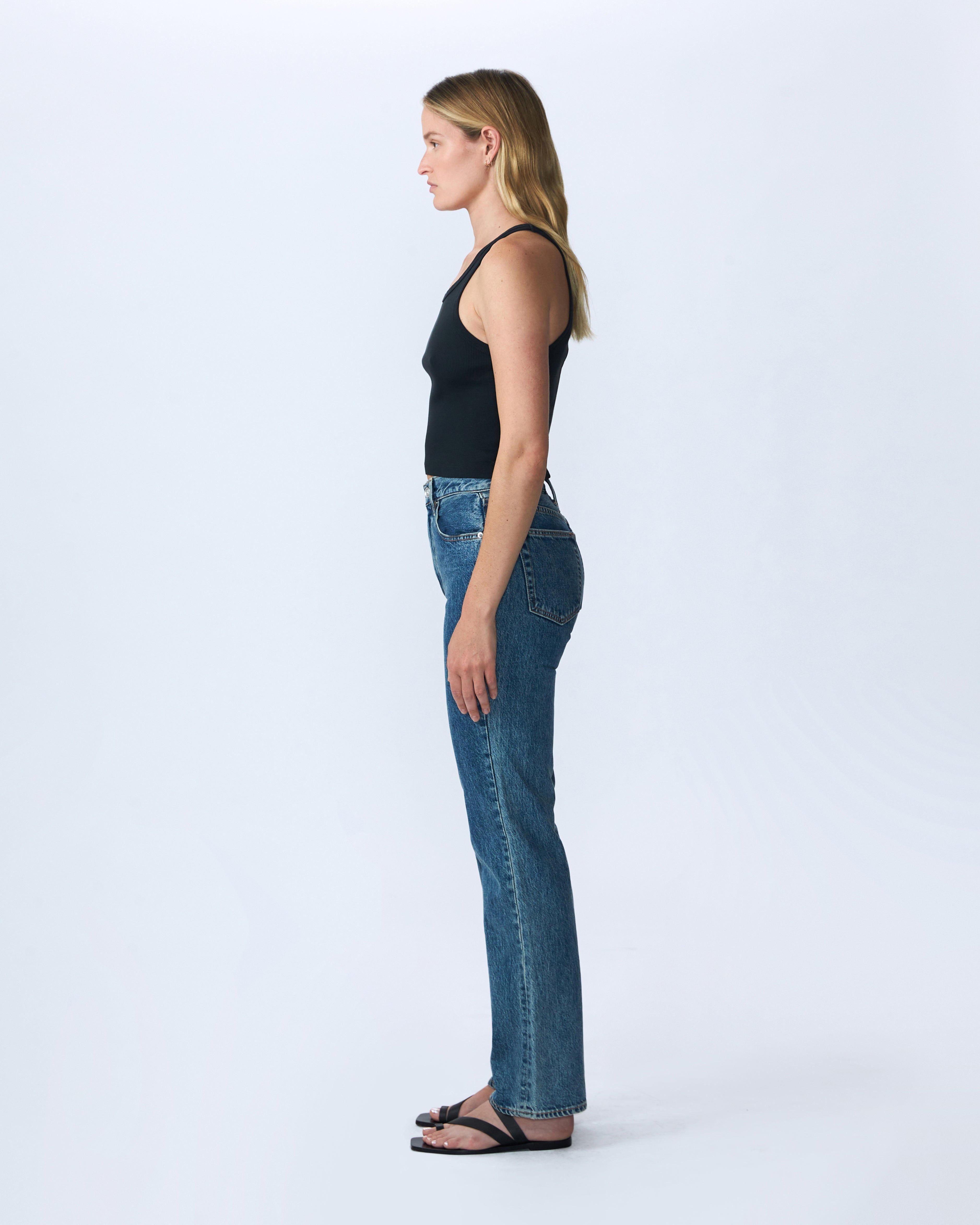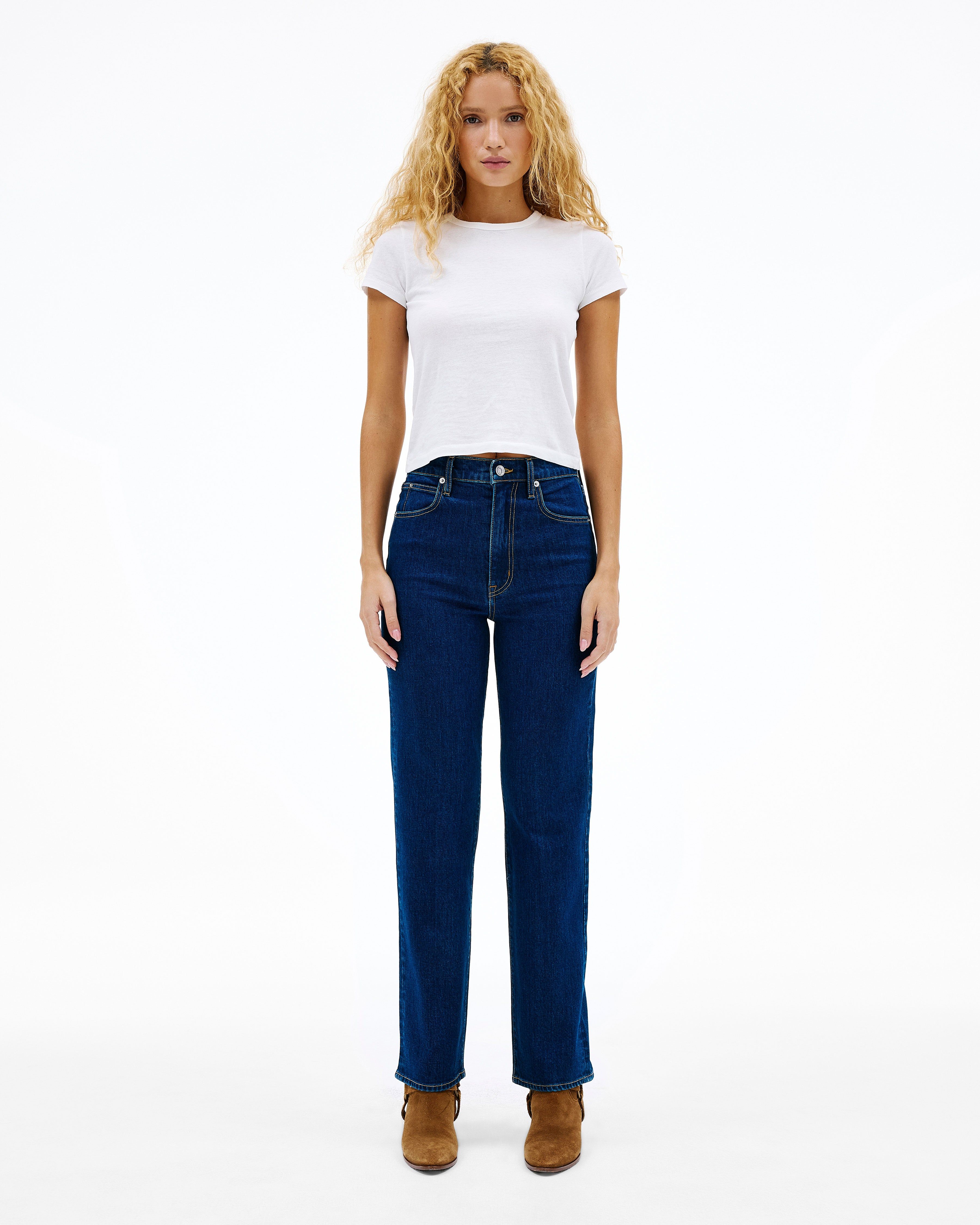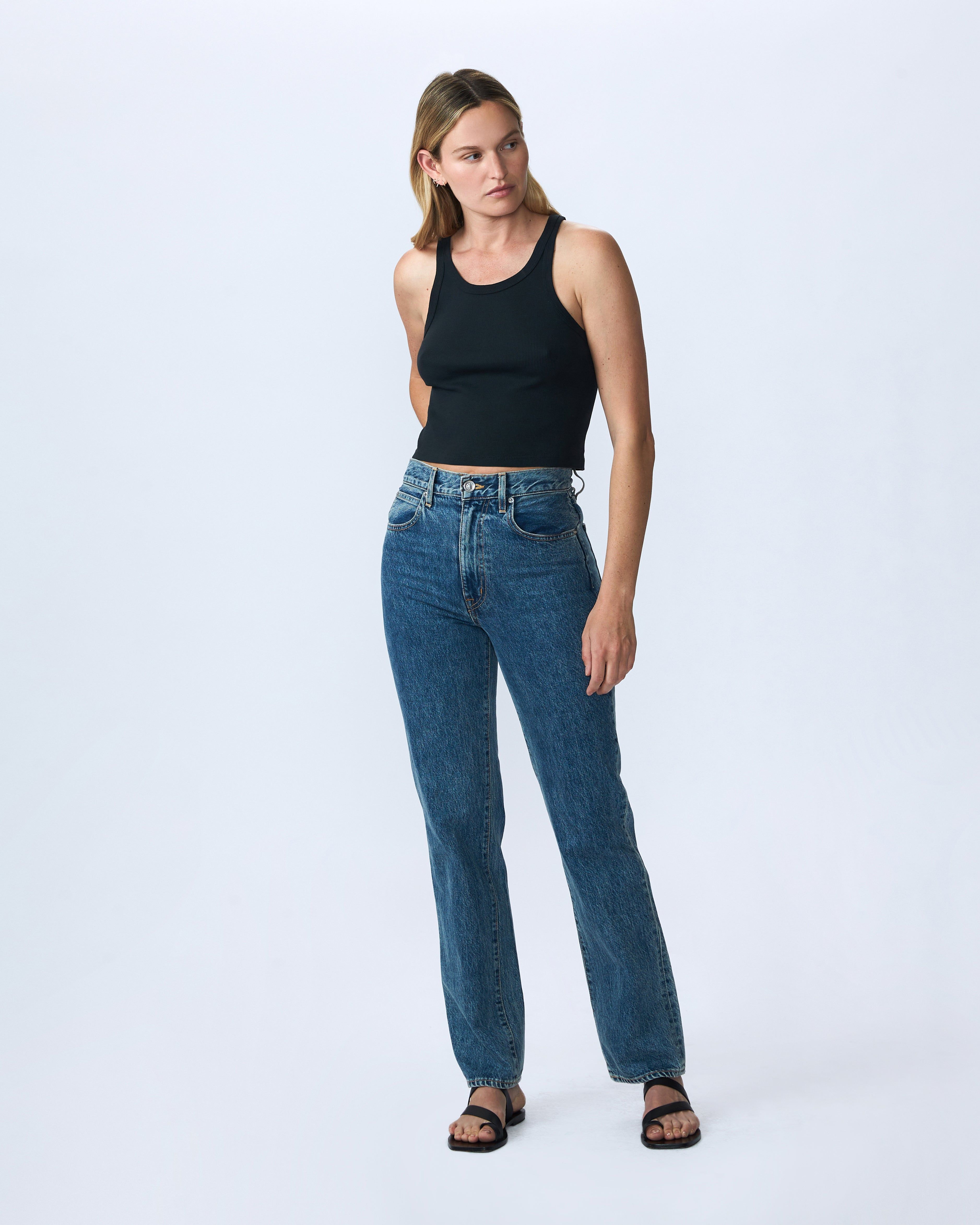 This signature style is designed to fit and flatter the feminine form, visually elongating the leg with a straight leg silhouette and high rise.