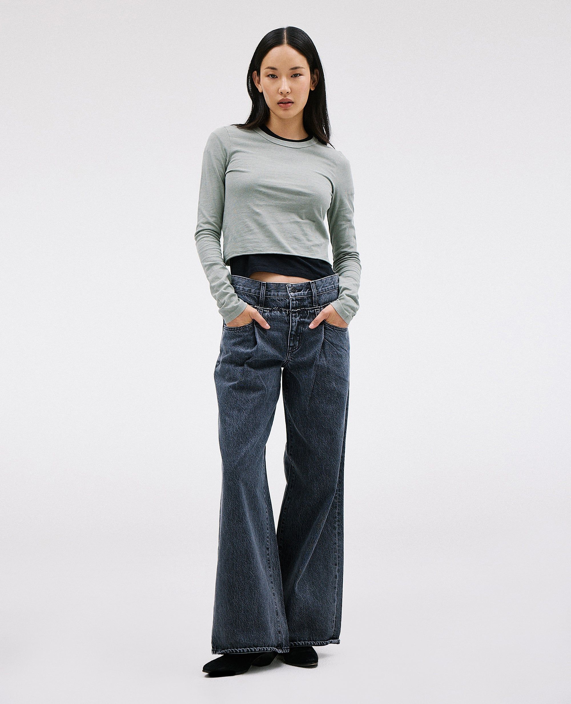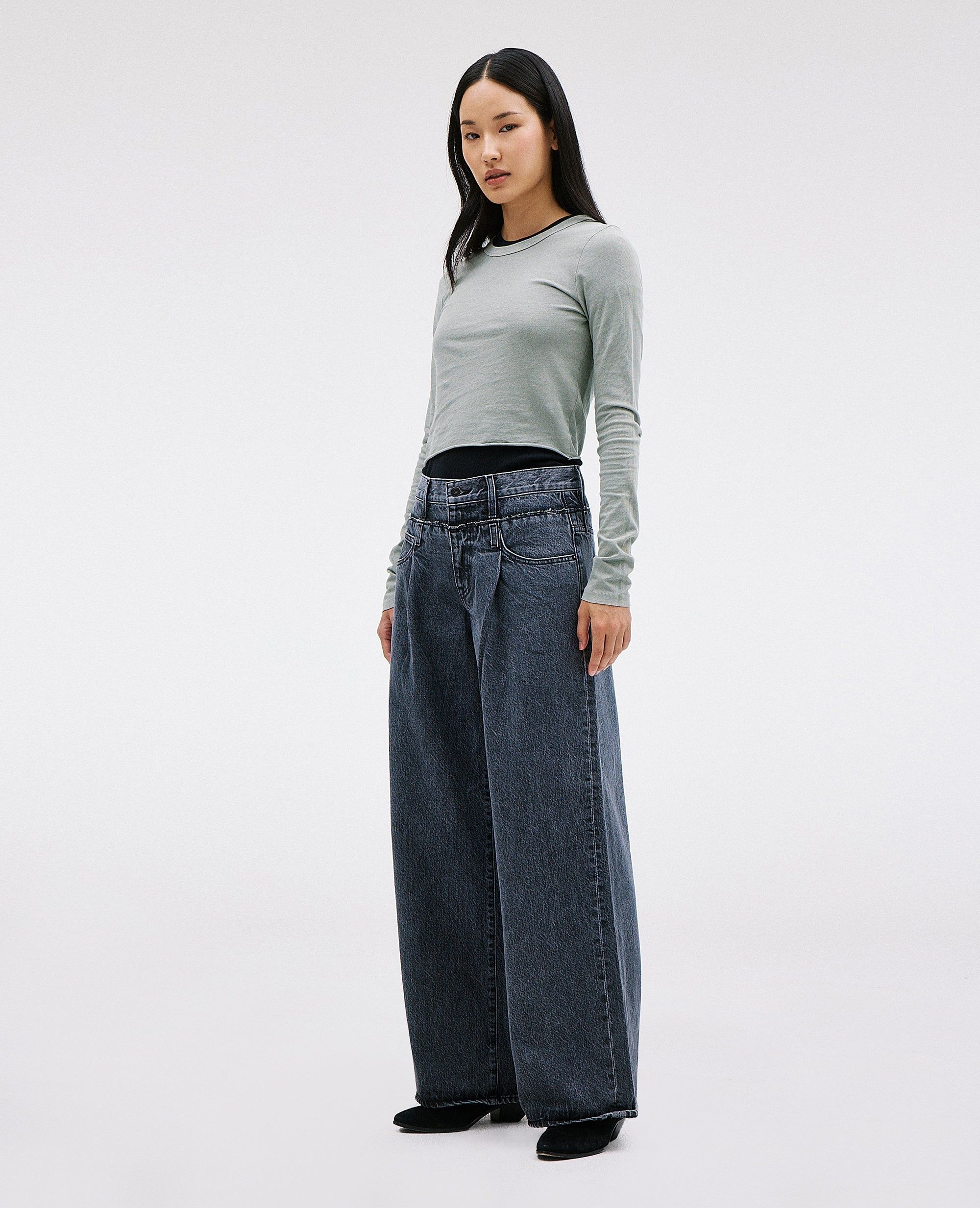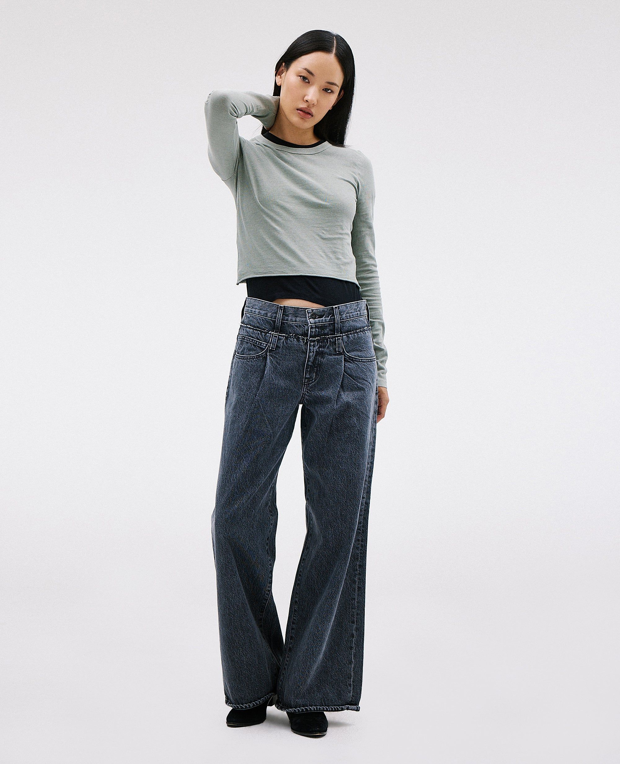 Re-Work reimagines Eva and Taylor silhouettes for a seamless blend. Crafted with a high rise, pleats and super-wide leg silhouette created to elongate the legs.