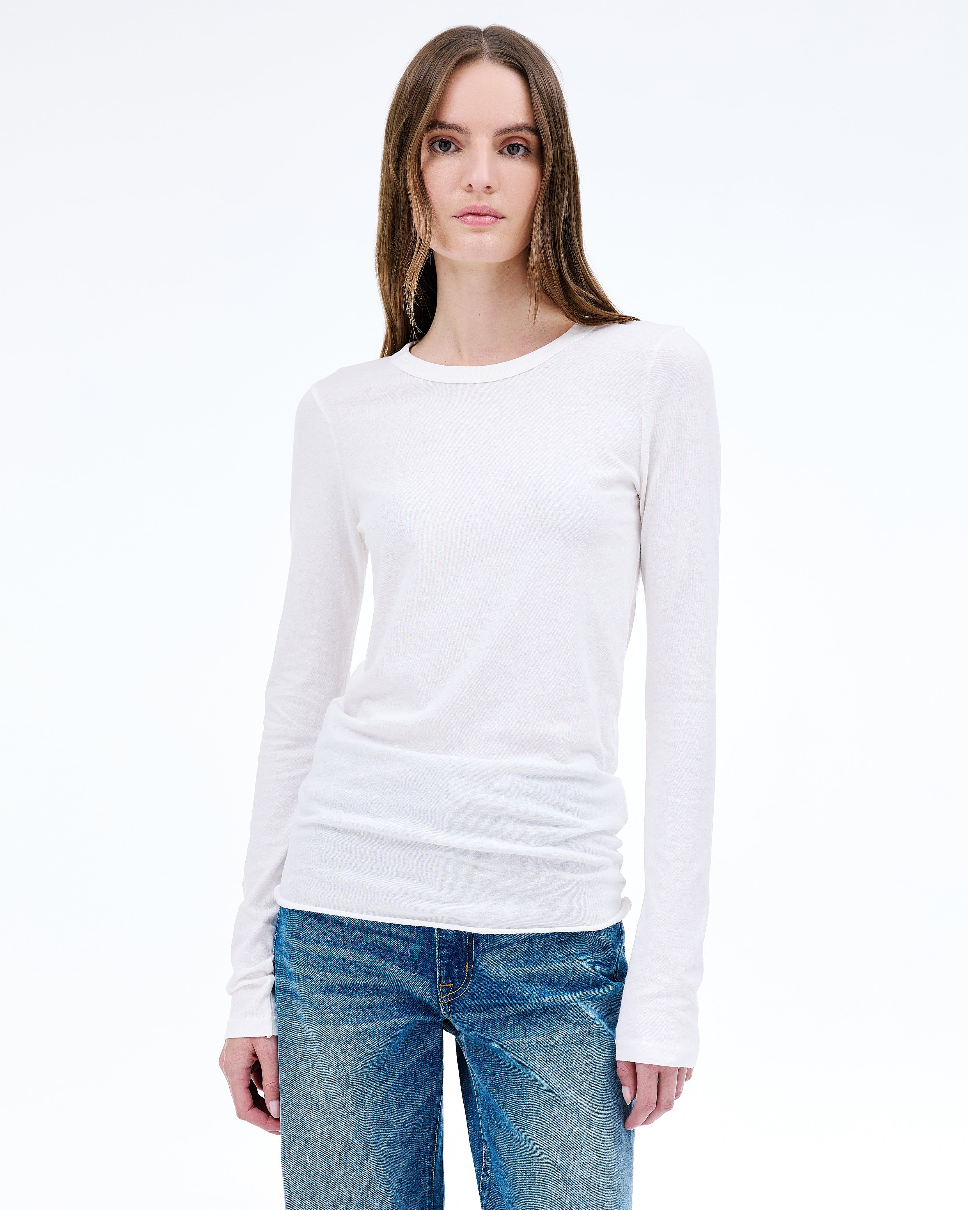 Crafted from a light weight open-end fabric for an authentic vintage look and feel. This modern silhouette features a long cap sleeve and fitted silhoutte.