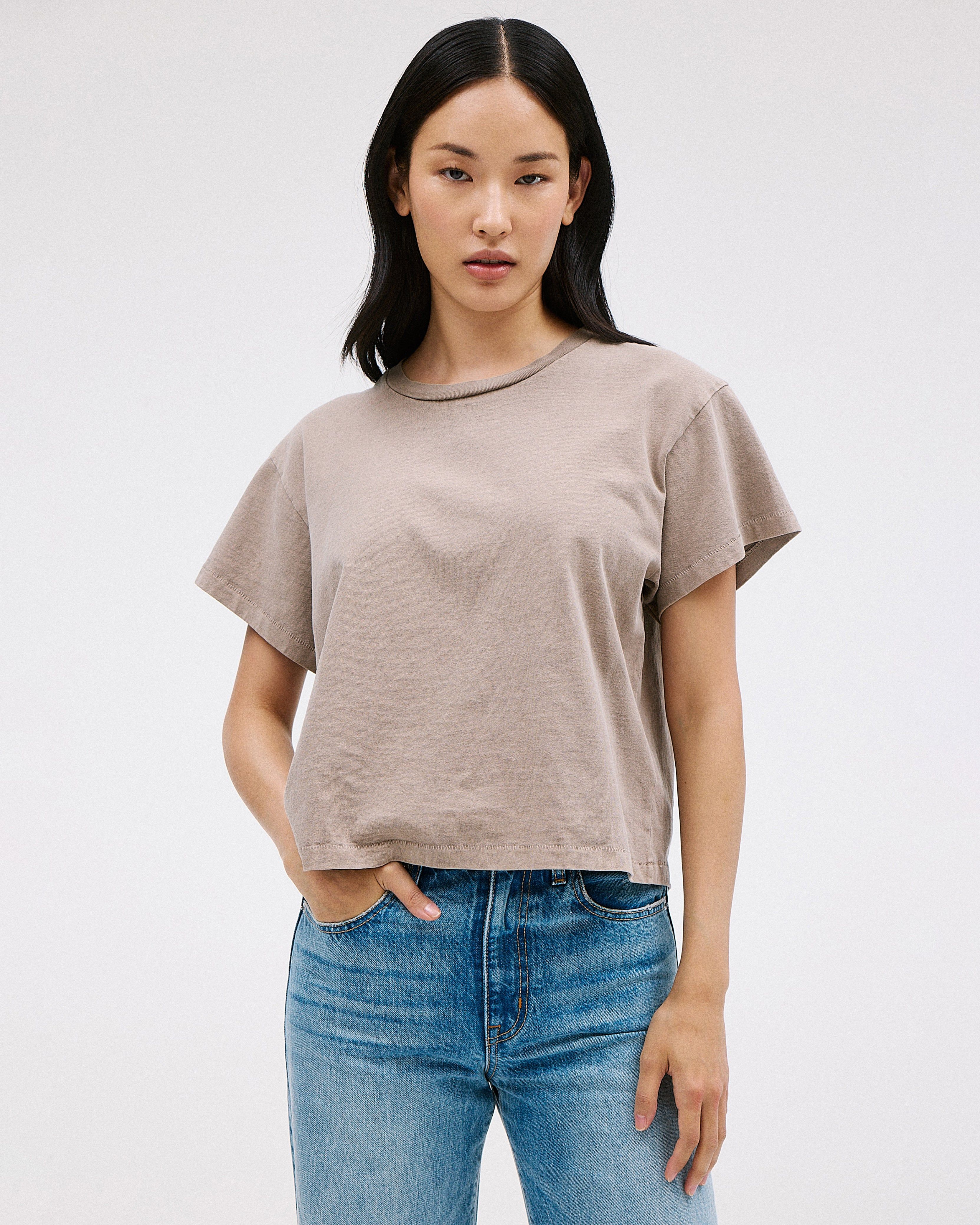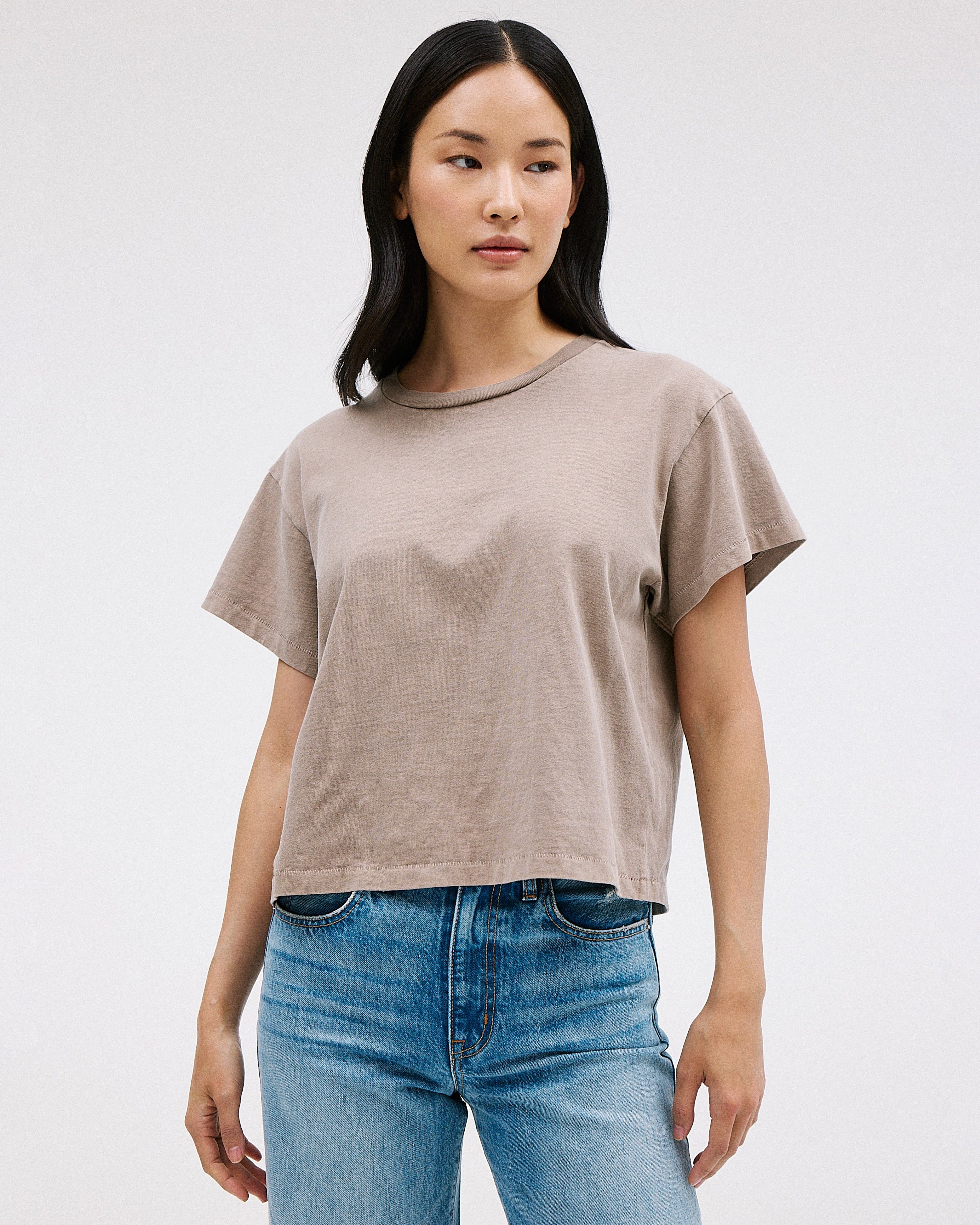Square Tee is crafted from a mid weight open-end fabric for an authentic vintage look and feel. This modern tee features a cap sleeve and square silhouette.