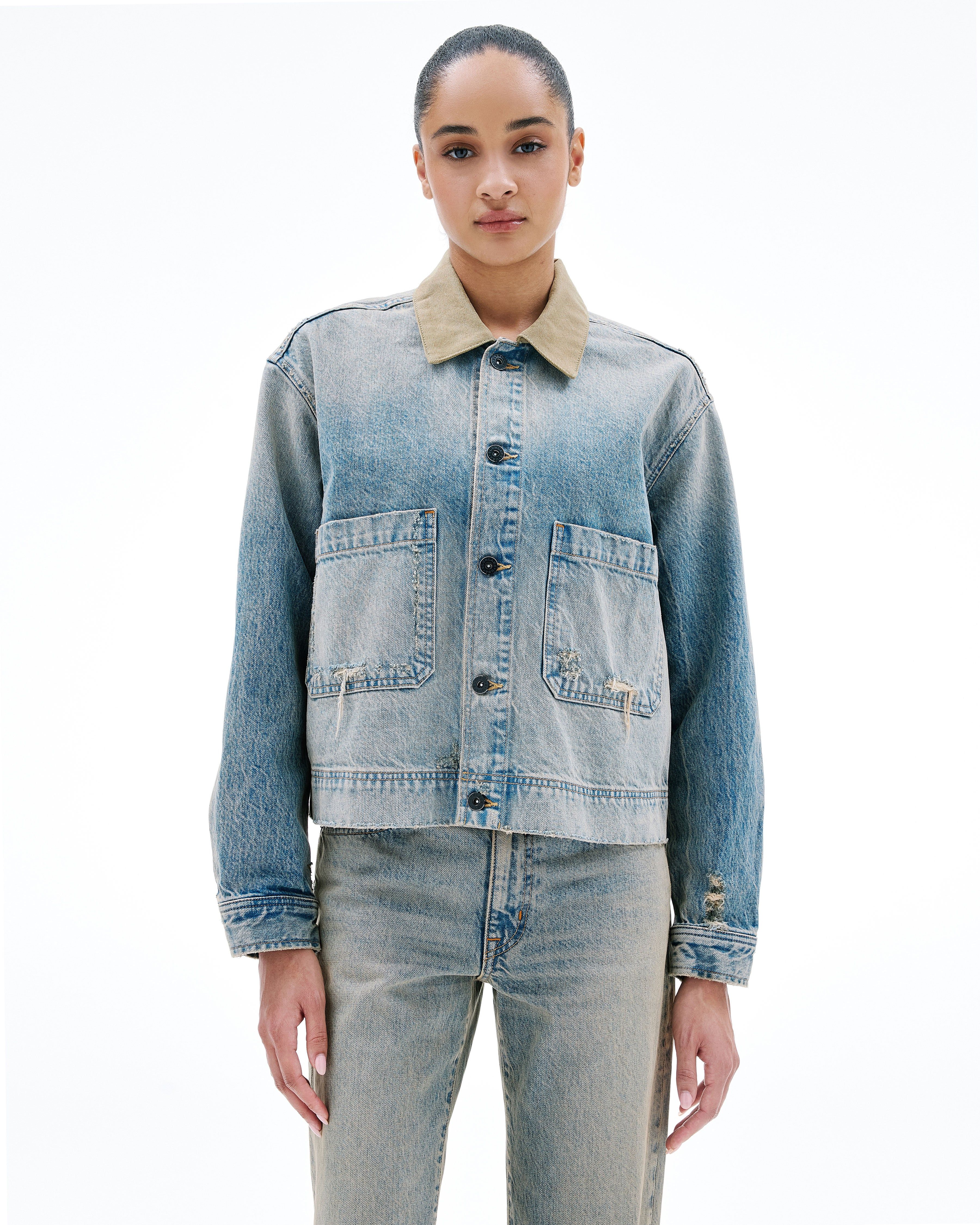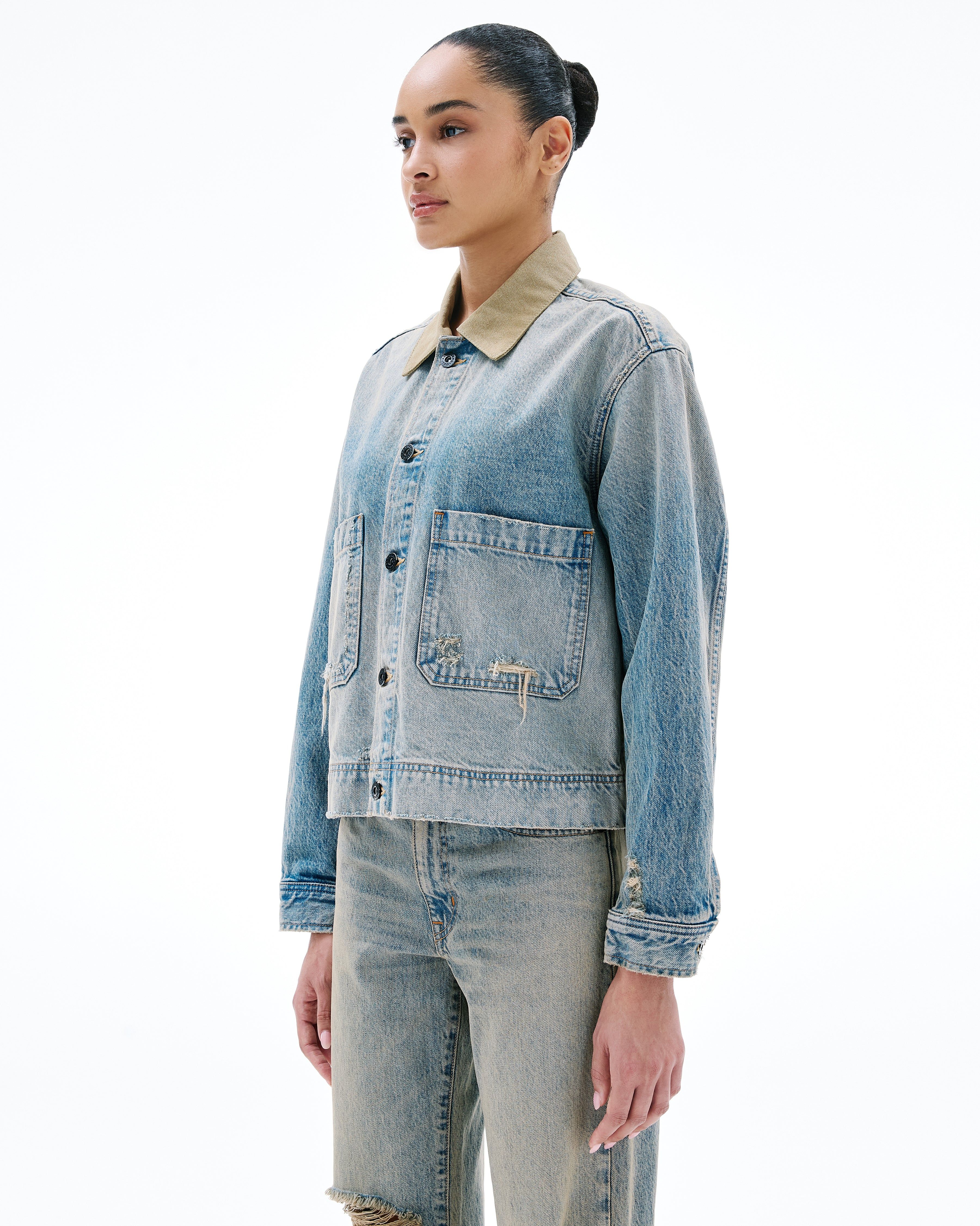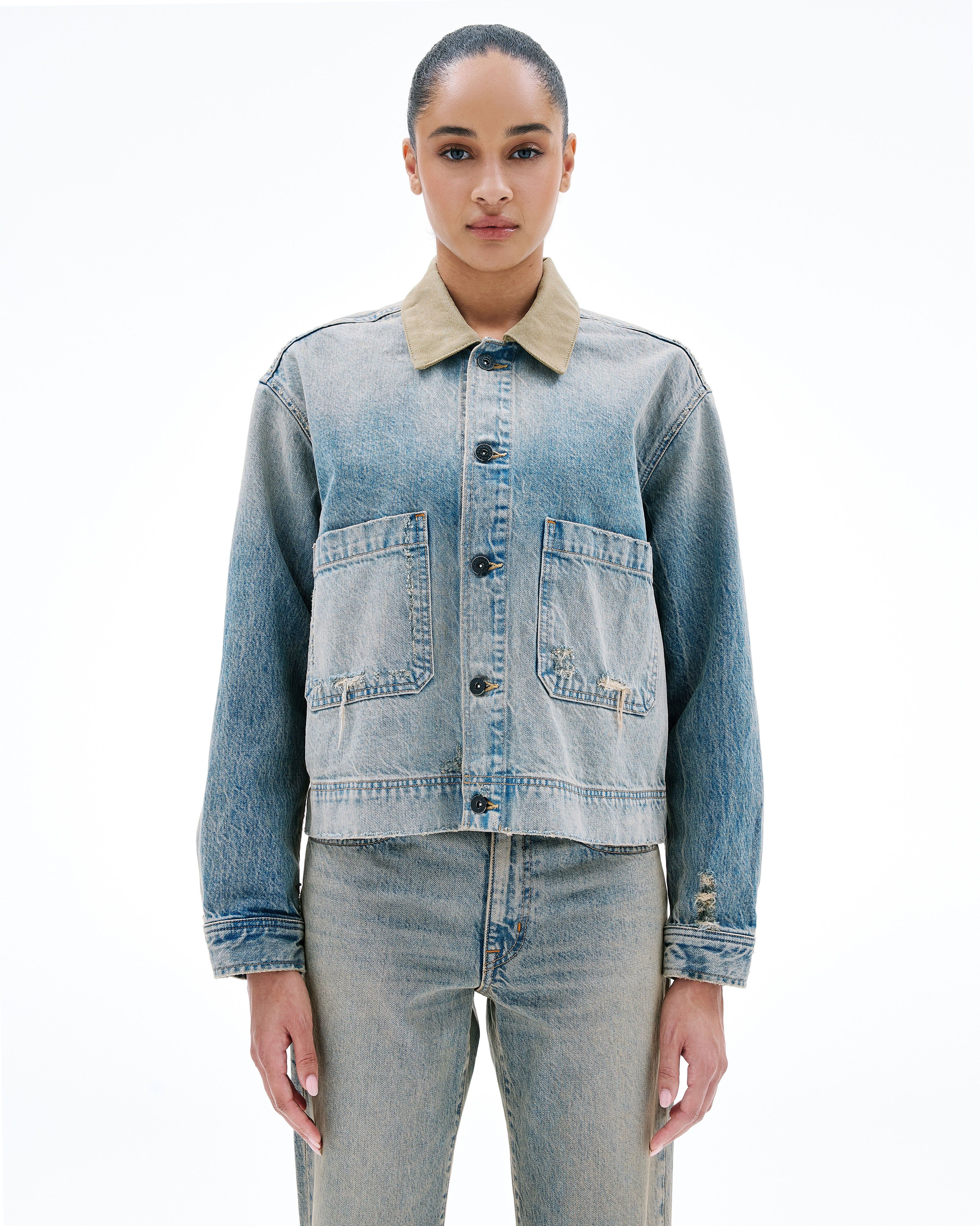 The Thompson Jacket is designed in a cropped, relaxed silhouette and features front patch pockets, an antique button closure, and a canvas collar.
