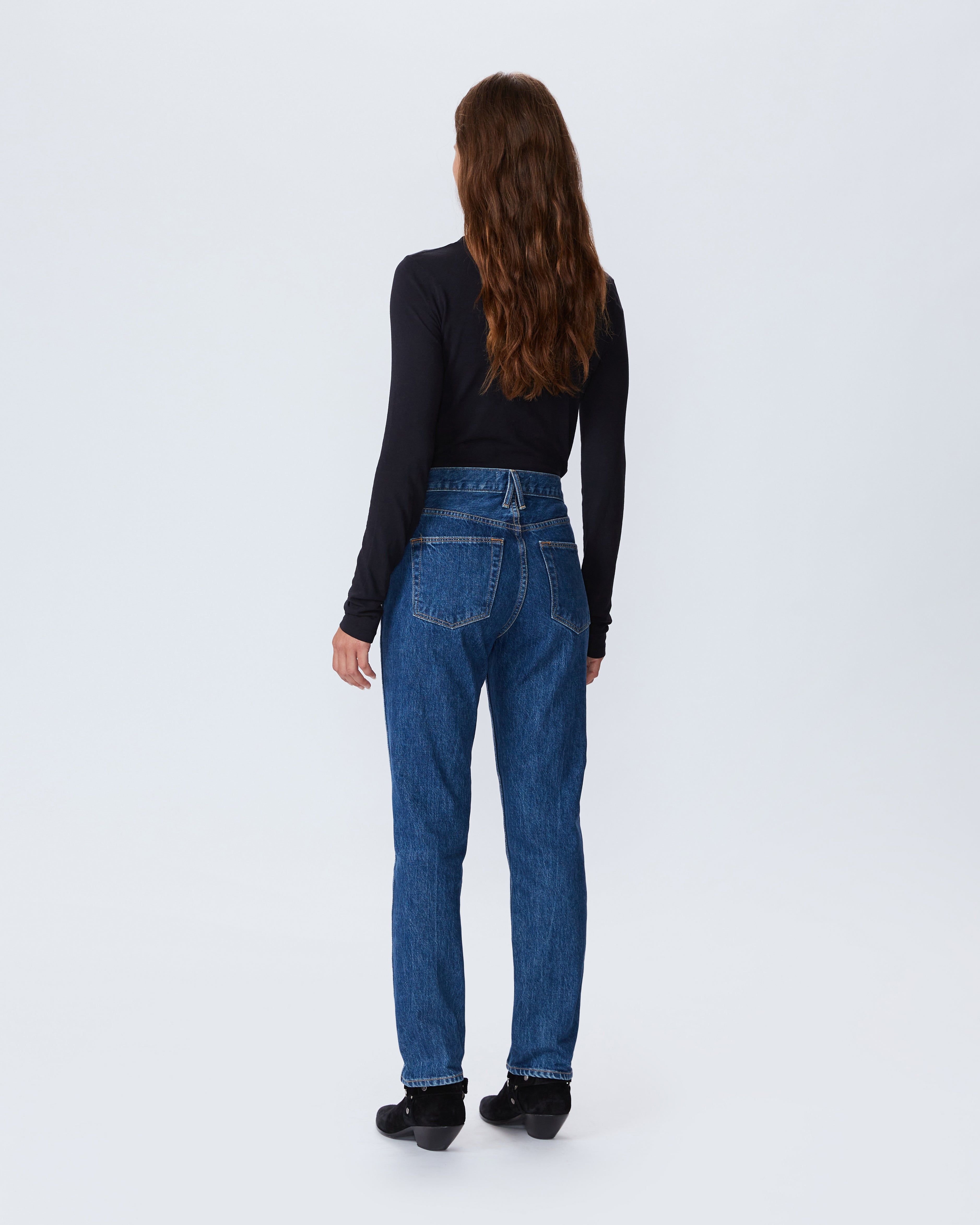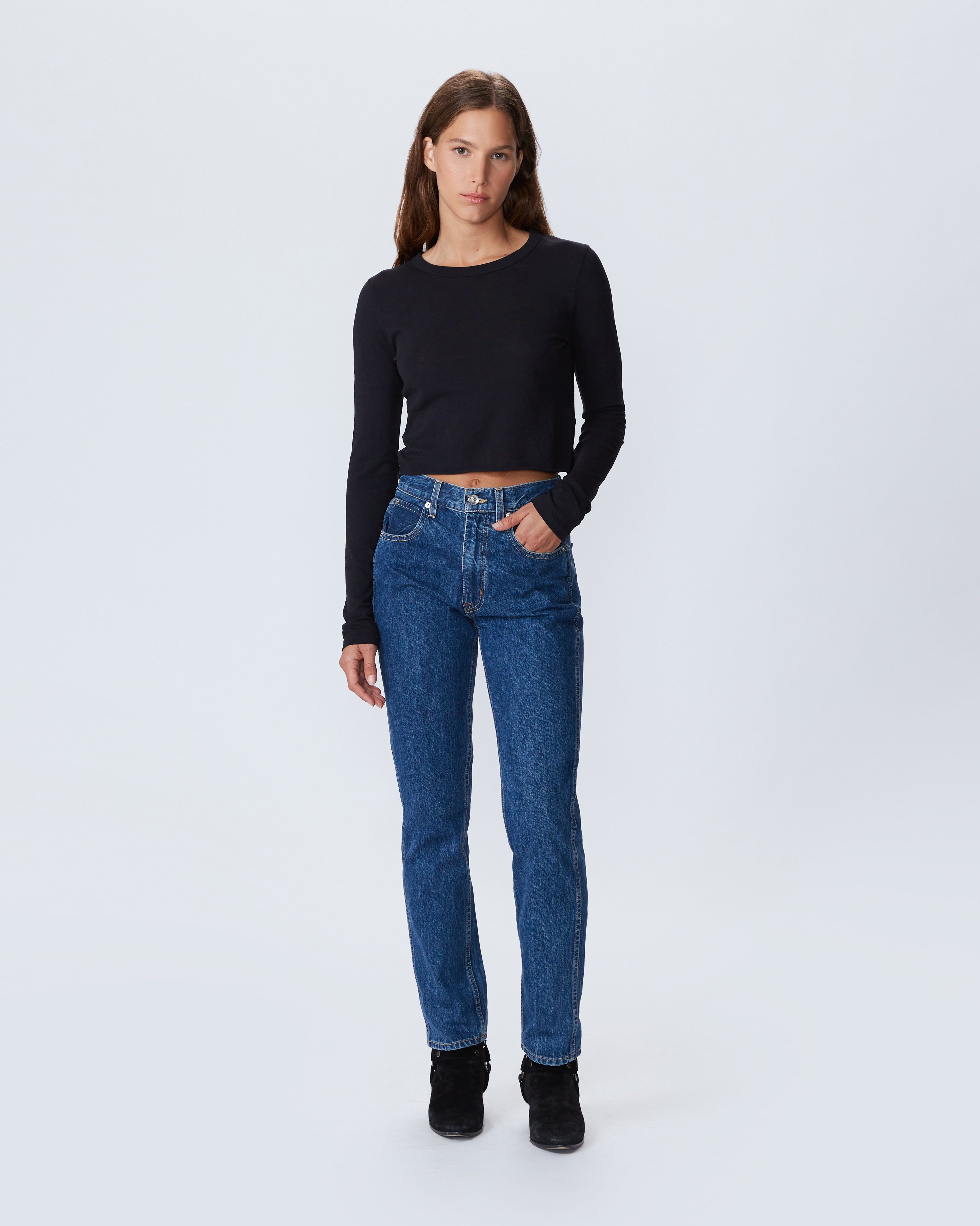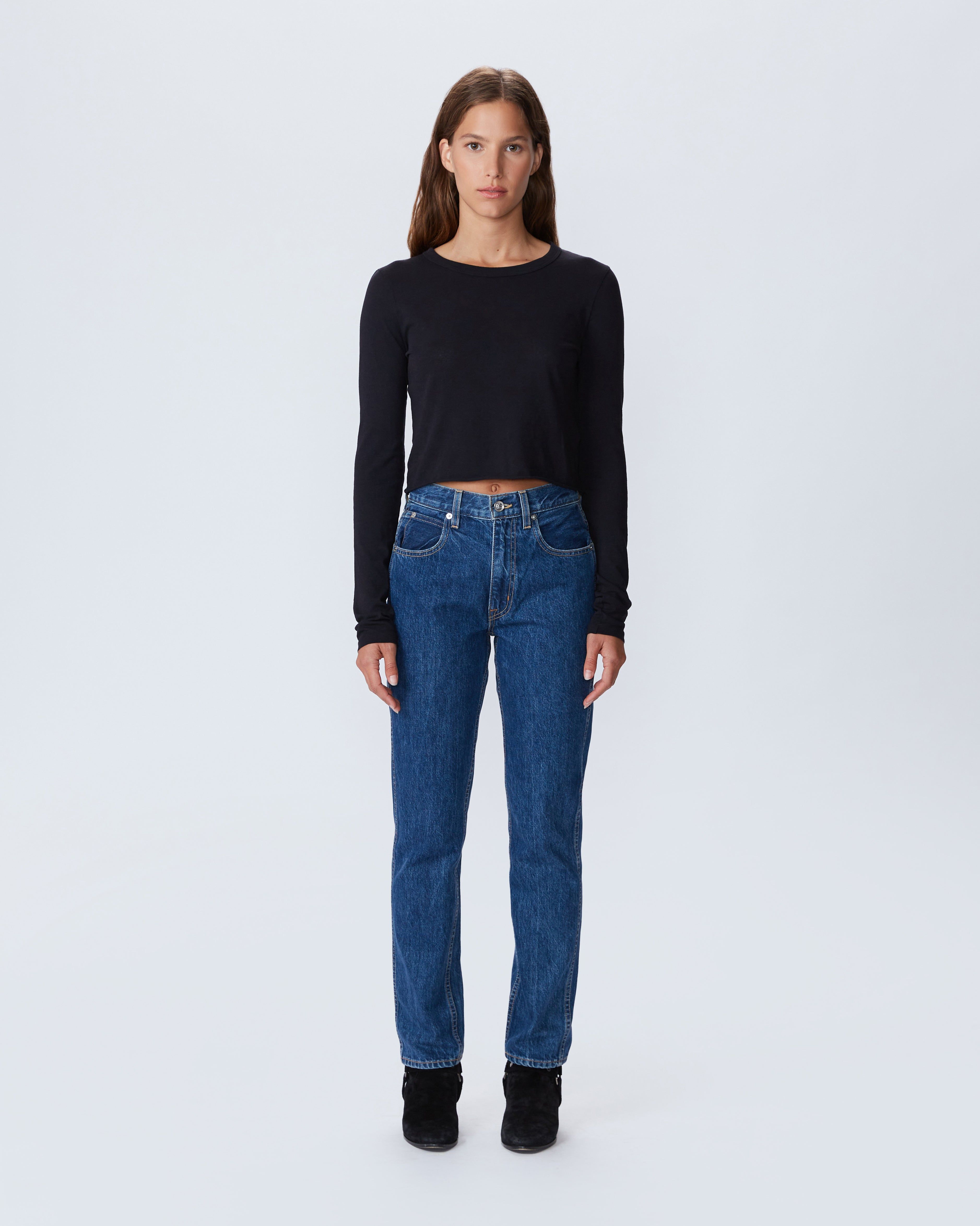 The Virginia Slim features a high rise, slim fit, and double topstitched inseam and outseam. Offering a sleek, cigarette silhouette for a modern, timeless look.